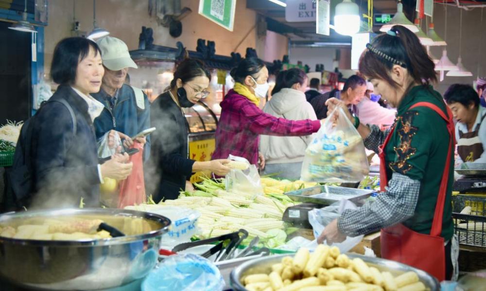 10月28日,昆明市五里多農(nóng)博廣場內(nèi),顧客在攤位前選購玉米。新華社記者王賢思 攝