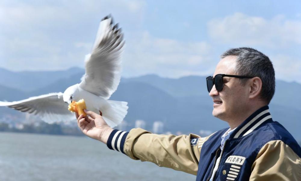 10月28日,昆明滇池邊海埂大壩上,游客在喂食紅嘴鷗。新華社記者王賢思 攝