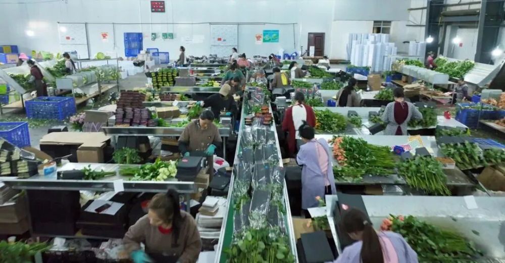 姚安縣花卉種植企業(yè)生產(chǎn)車間內(nèi)工人在包裝鮮切花