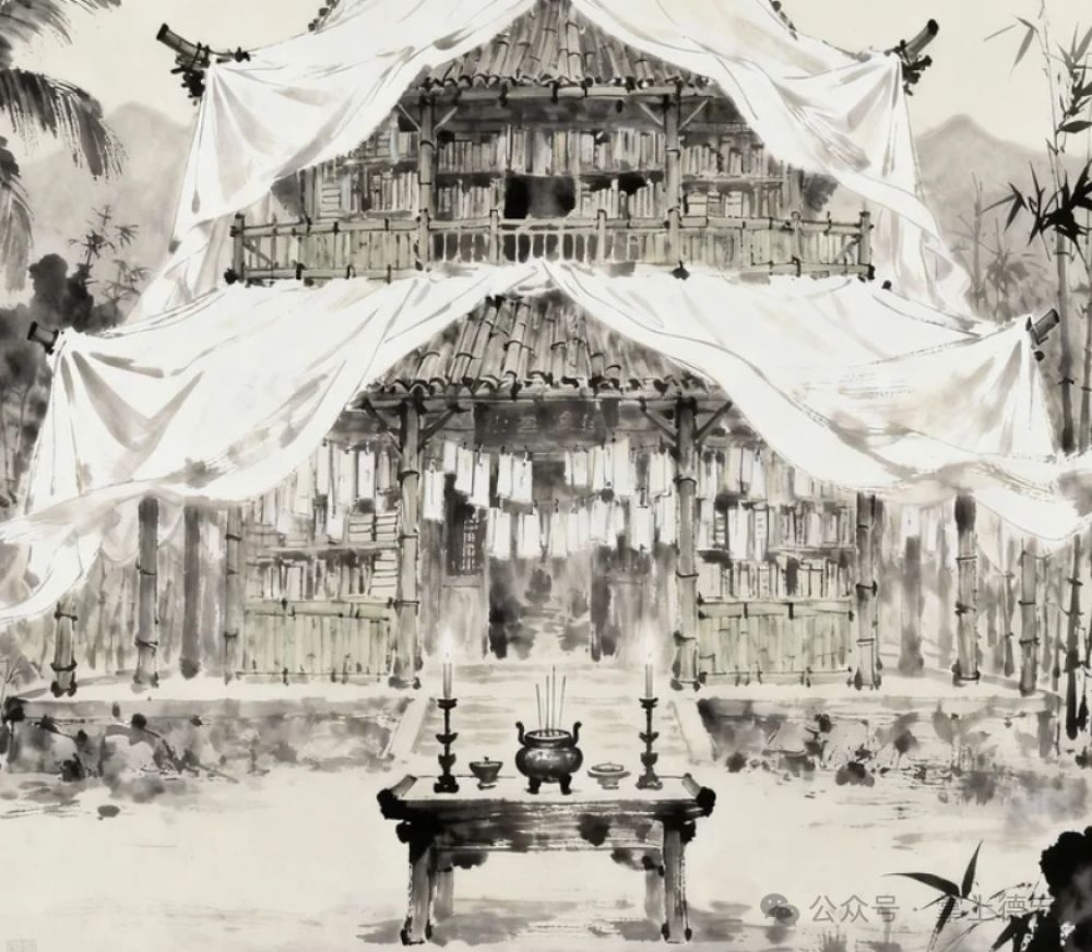 第三天,多罕賽吩咐兒子買來幾十丈白布,給自家住的竹樓和藏書樓上上下下全掛上了。接著,多罕賽身著重孝,并在竹樓前擺上香案,靜靜地等著大元冢二的到來。