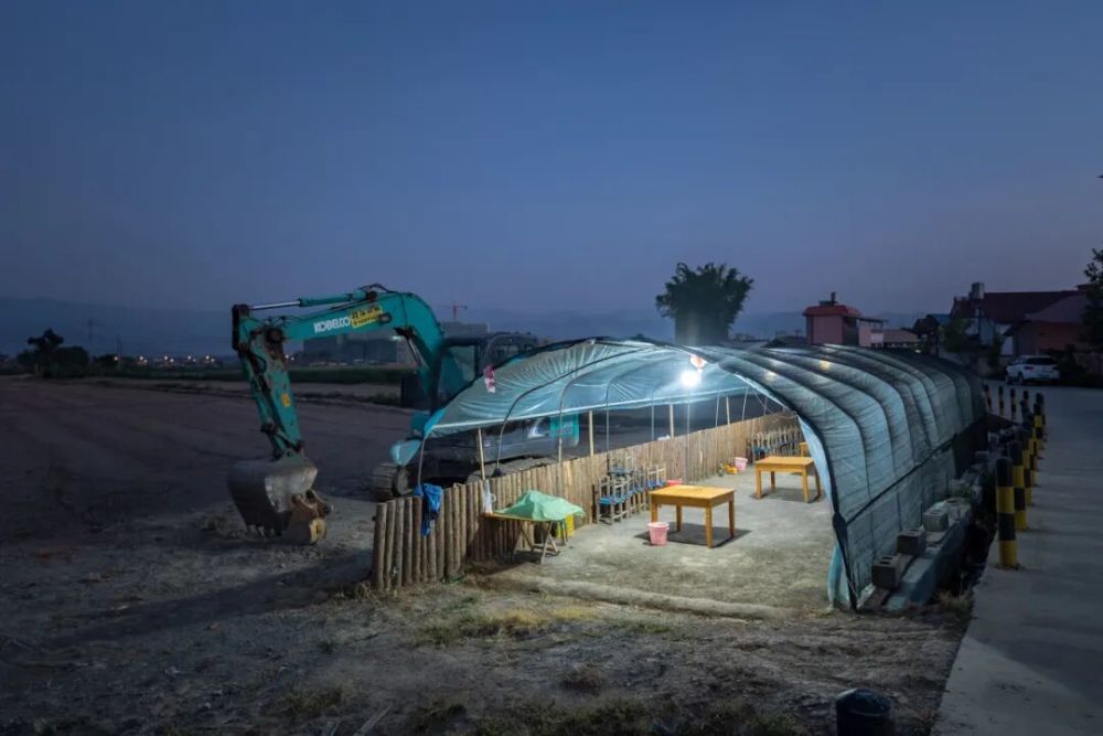2020年9月12日,莊郁蔥鏡頭里的巖貴一家在為晚上10點的出攤做著最后的準(zhǔn)備。25歲的騰巖貴是騰四的重孫輩,自小習(xí)得佛板雕刻技藝。手工技藝耗時費工,難以維持生計,母親幫著巖貴在芒市河橋邊支起一個小小的攤位,由于正對施工入口,鐵路工人成了這里主要的客源,拌菜、涼粉、烤肉、飲品都需要現(xiàn)買現(xiàn)做。忙起來的時候,4歲的小兒子騰春就只能放在就手的地方。疫情期間生意并不好做,但他們始終相信只要誠信加上勤快就一定會有好的回報。