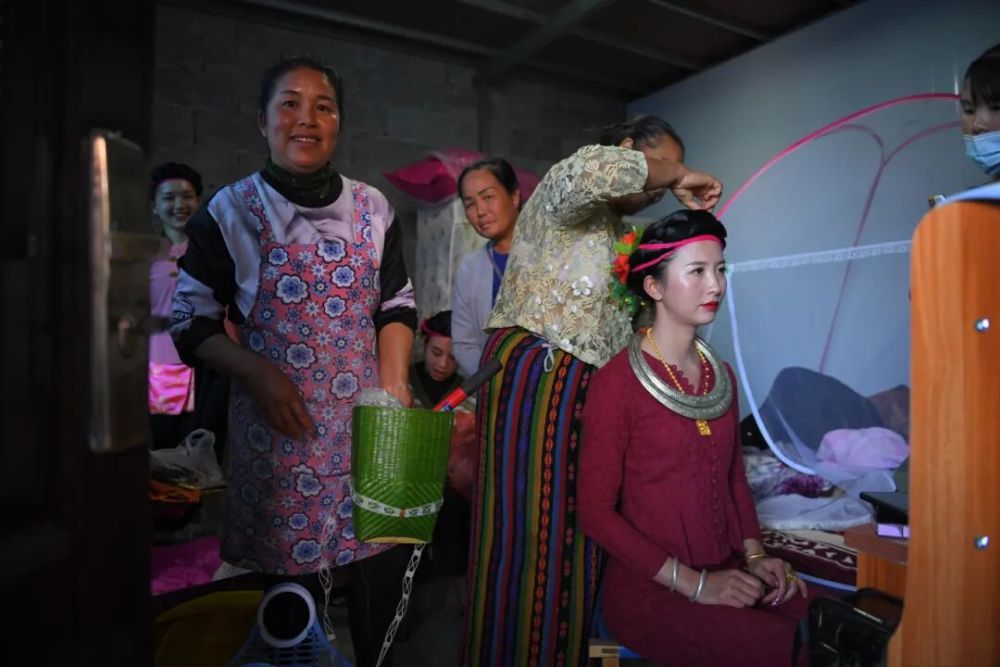 2021年1月20日是芒掌村搬遷后第一位從安置房出嫁的傣族姑娘莫喊建出嫁的日子。小莫在城里的珠寶店做銷售,是村里數(shù)一數(shù)二的能干姑娘。在供著佛龕的堂屋前拜別親人,她就要帶著全村長輩的祝福,跟隨新郎去往離家?guī)资锿獾睦看濉Gf郁蔥的鏡頭里,媽媽俯身為女兒的嫁衣別上金子打制的鳳凰扣飾,祝福她的新生活幸福美滿。