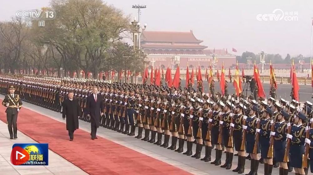 費(fèi)利佩六世抵達(dá)時(shí),禮兵列隊(duì)致敬。習(xí)近平同費(fèi)利佩六世登上檢閱臺(tái),軍樂(lè)團(tuán)奏中西兩國(guó)國(guó)歌,天安門(mén)廣場(chǎng)鳴放禮炮21響。費(fèi)利佩六世在習(xí)近平陪同下檢閱中國(guó)人民解放軍儀仗隊(duì),并觀看分列式。