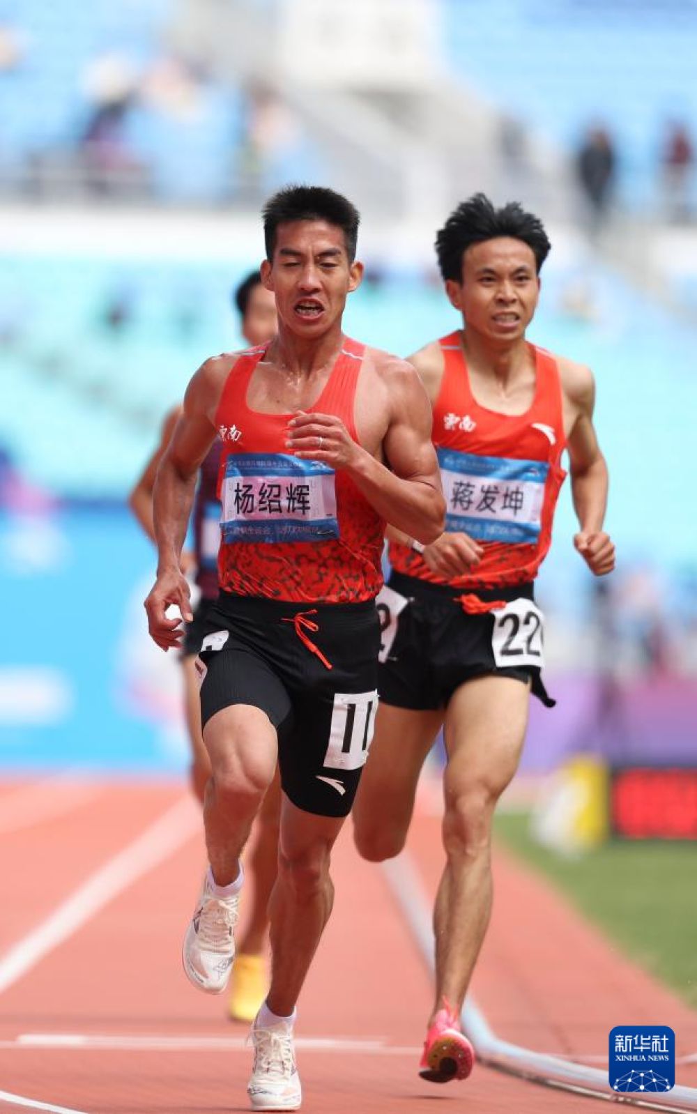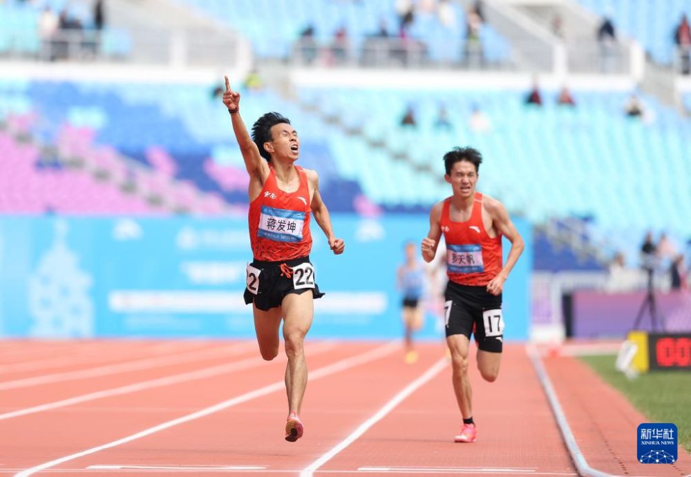 ??11月20日,云南隊(duì)選手蔣發(fā)坤(左)沖過終點(diǎn)后慶祝。最終,他奪得冠軍。
