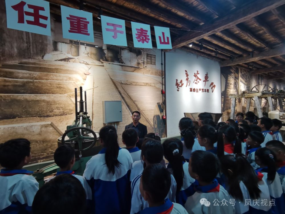 理論知識(shí)的余溫未散,孩子們又跟隨張成仁老師的腳步,走進(jìn)了承載著滇紅茶記憶與技藝的滇紅茶活態(tài)博物館。在這里,課堂從“聽到”變?yōu)椤翱吹健?,認(rèn)真地聽老師介紹滇紅鳳慶抗戰(zhàn)茶歷史和各種制茶工具,孩子們的好奇心被徹底點(diǎn)燃。