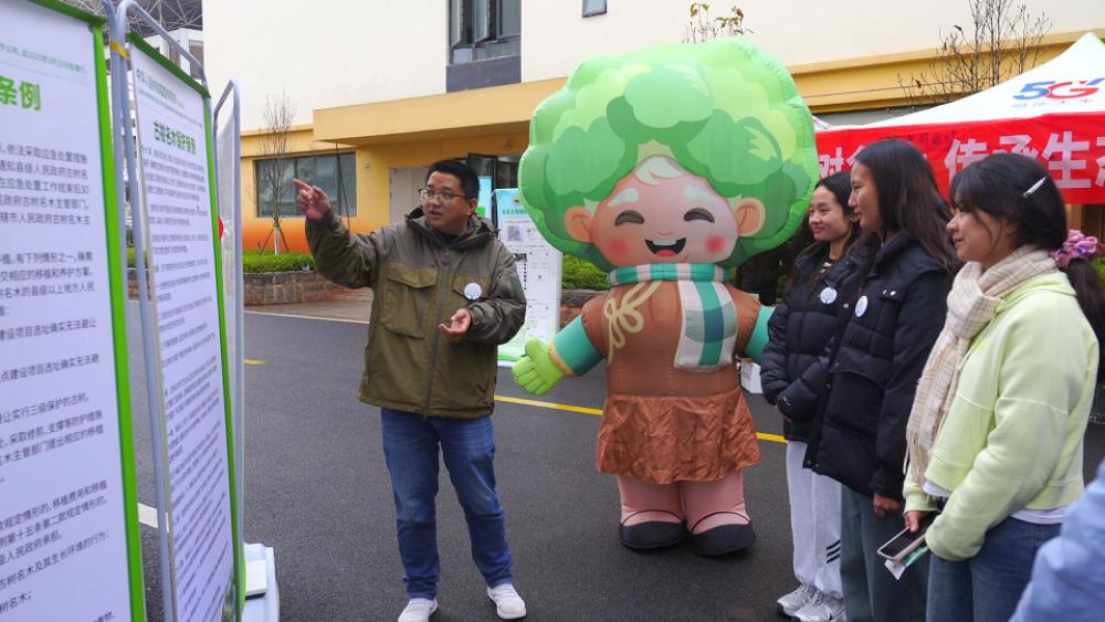當(dāng)天中午,宣傳周活動來到了云南林業(yè)職業(yè)技術(shù)學(xué)院。昆明市林業(yè)和草原科技推廣總站的工作人員走進(jìn)校園,通過設(shè)置科普展板,發(fā)放《古樹名木保護(hù)條例》、昆明古樹名木宣傳折頁等,向師生普及古樹名木保護(hù)知識。活動現(xiàn)場還設(shè)置了趣味互動問答、“與‘古樹爺爺奶奶’合影打卡”等環(huán)節(jié),吸引眾多學(xué)生積極參與。