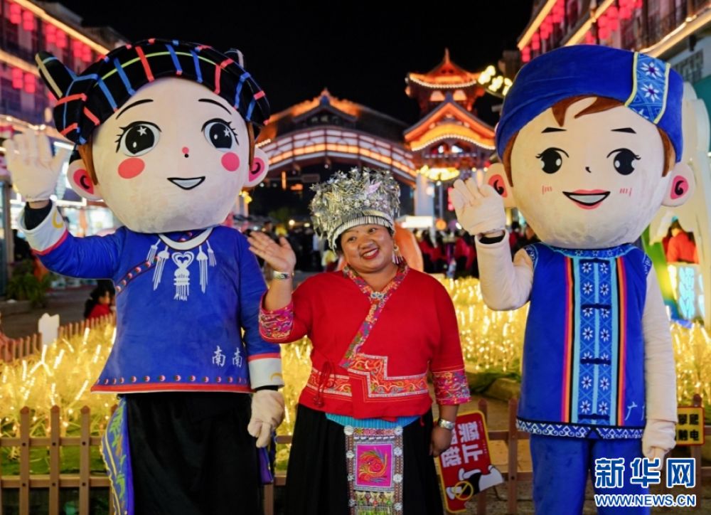 ??活動(dòng)中,壯族銅鼓舞的古老節(jié)奏在街區(qū)回響,法治宣傳人員現(xiàn)場(chǎng)開(kāi)展普法宣傳,游客們體驗(yàn)著掛紅雞蛋、接繡花福袋等迎客禮儀,特色小吃、非遺產(chǎn)品等吸引著眾多游客駐足消費(fèi)。從壯鄉(xiāng)攔門酒到開(kāi)街亮燈儀式,從非遺銅鼓舞到普法宣傳,此次直播串聯(lián)起廣南縣蓮湖公園與北城門的街區(qū),將民族文化與人文風(fēng)情巧妙融合,充分展現(xiàn)句町夜花街文旅融合的創(chuàng)新實(shí)踐。