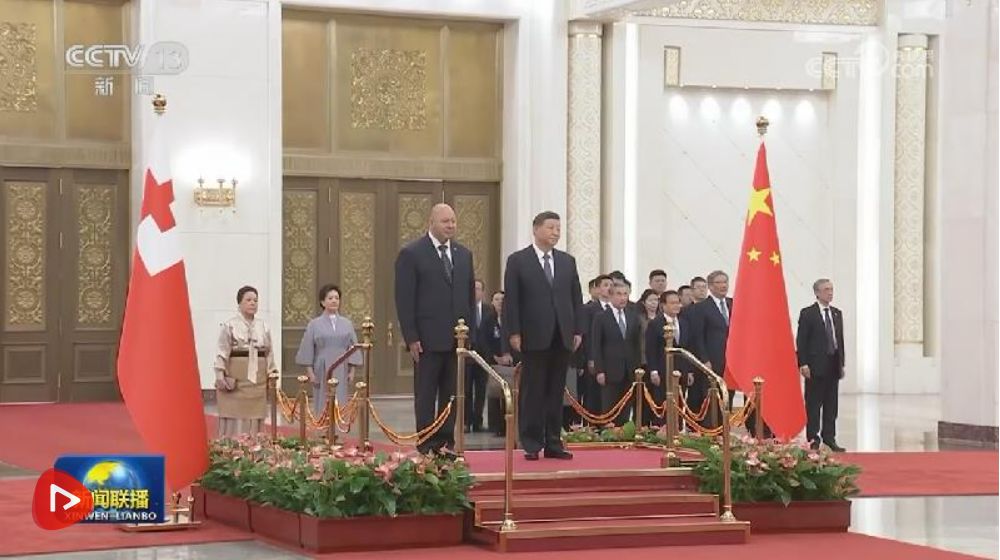 會見前,習(xí)近平和夫人彭麗媛在人民大會堂北大廳為圖普六世和王后娜娜茜帕烏舉行歡迎儀式。