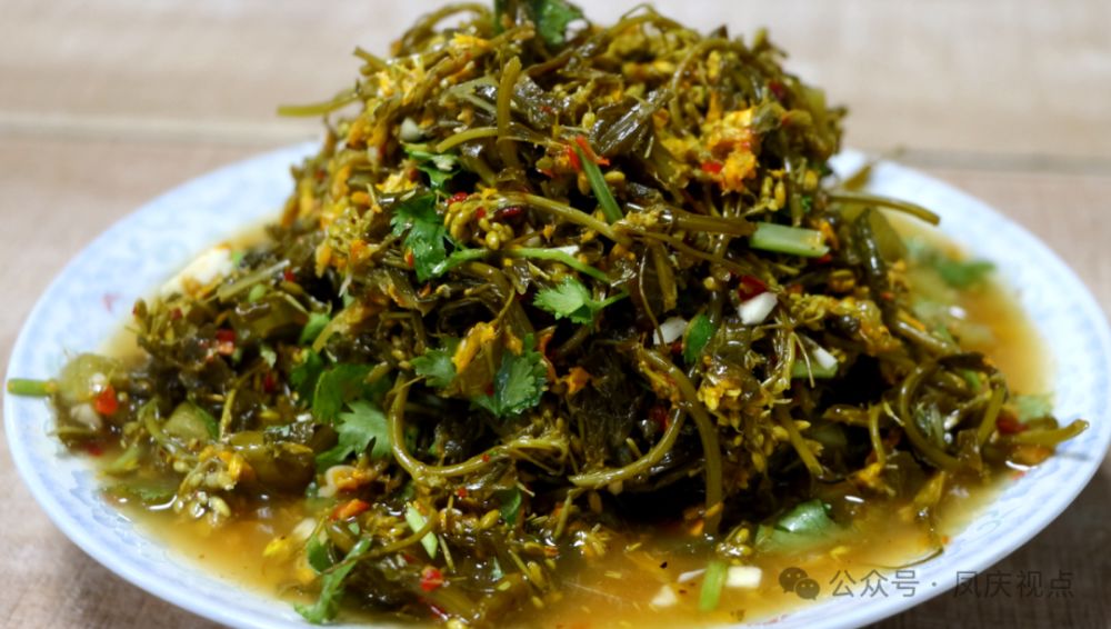 當(dāng)瀾滄江畔的橄欖還掛在枝頭,三岔河鎮(zhèn)的油菜田已迎來(lái)了豐收。初冬的陽(yáng)光灑在田野上,一壟壟油菜長(zhǎng)得又青又直,等到花穗剛長(zhǎng)出來(lái)、花苞還沒(méi)開(kāi)的時(shí)候,就是做腌菜的最佳時(shí)機(jī)。天剛亮,村里的婦女們就提著籃子下田,專門挑最嫩的花穗摘,金黃與翠綠在竹籃里堆疊著,透著冬日的生機(jī)。采回來(lái)的油菜花用清水洗凈、自然晾干后,輕輕放進(jìn)陶罐,撒少許紅糖,再注滿涼開(kāi)水密封好。一周后揭開(kāi)壇蓋,酸香瞬間就竄滿了屋子—— 這腌菜既保留了花穗的鮮嫩,又多了發(fā)酵帶來(lái)的微酸,吃起來(lái)清爽開(kāi)胃。最簡(jiǎn)單的吃法,就是拌上鹽巴、芫荽和蘸水辣,立馬成了開(kāi)胃下飯的佳品。到了殺豬宴上,往腌菜里拌入肉末更是點(diǎn)睛之筆,酸鮮與肉香碰撞在一起,成了招待賓客的招牌菜?!俺砸惑珉绮恕保钱?dāng)?shù)厝苏?qǐng)年豬客時(shí)常掛在嘴邊的話,這口酸爽里,封存的不只是冬日的鮮美,更是鄰里相聚的熱絡(luò)與化不開(kāi)的鄉(xiāng)愁。