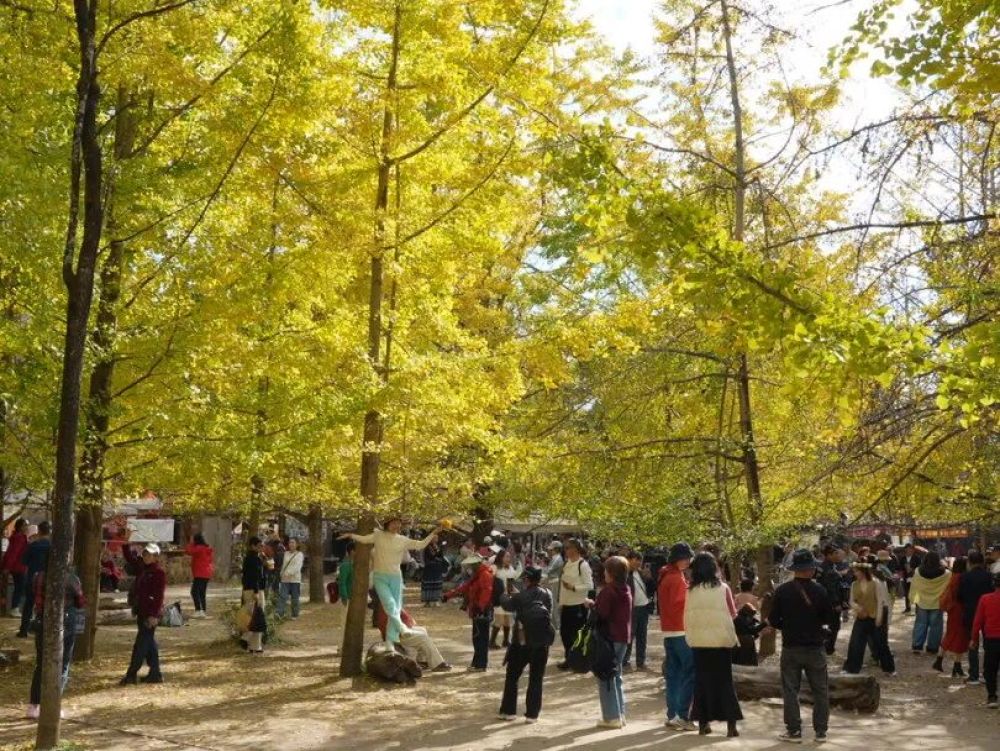每年的11月下旬,江東村的銀杏進入最佳觀賞期。4萬余棵古銀杏樹將整個村莊染成一片純粹而耀眼的金色,滿村盡戴黃金甲。輕風拂過,金葉如蝶般飛舞落在房檐上、路面上……村里的銀杏廣場、農(nóng)家小院、青石板小巷,到處擠滿了拍照打卡、品嘗銀杏美食的游客,人們盡情陶醉在這大自然的美景中?!拔覀儚纳轿魈瓕iT到騰沖看銀杏樹,挺漂亮、挺美!氣候又溫暖,比我們那里暖和,挺好的!”來自山西的游客任女士對騰沖、對銀杏村美景贊不絕口。