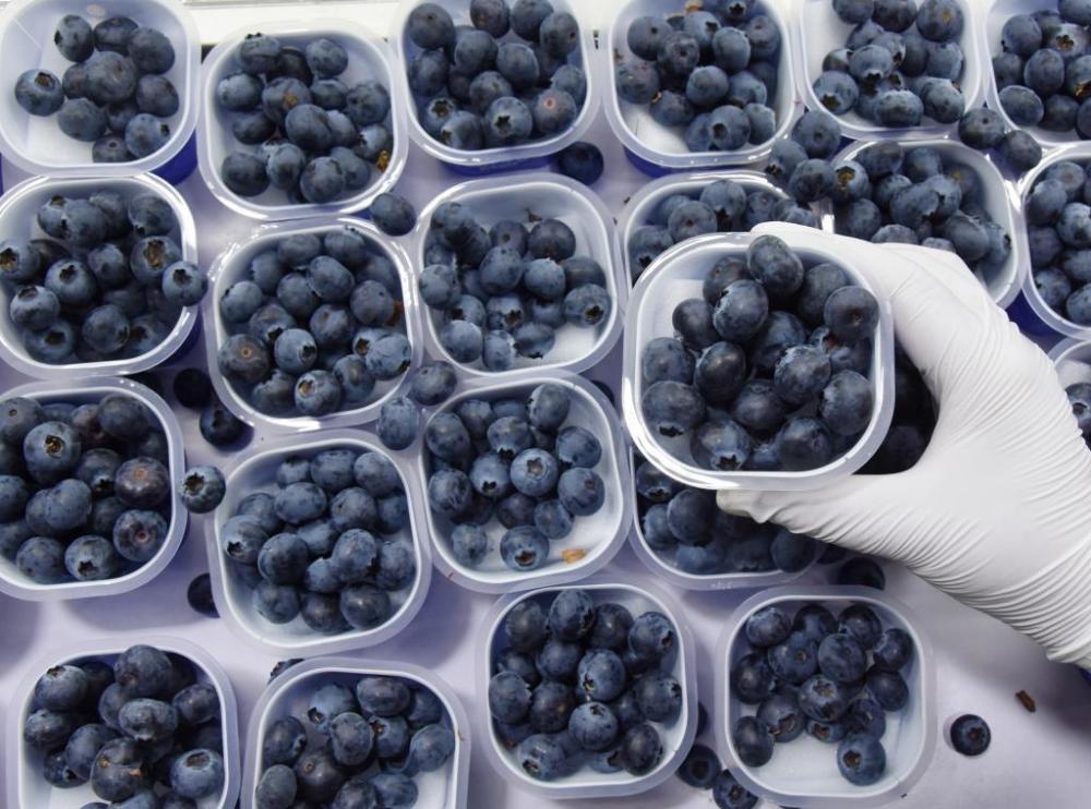 ??農(nóng)戶在云南省蒙自市草壩鎮(zhèn)繽紛農(nóng)業(yè)示范基地的冷藏庫里分揀藍(lán)莓。新華社發(fā)(薛瑩瑩 攝)