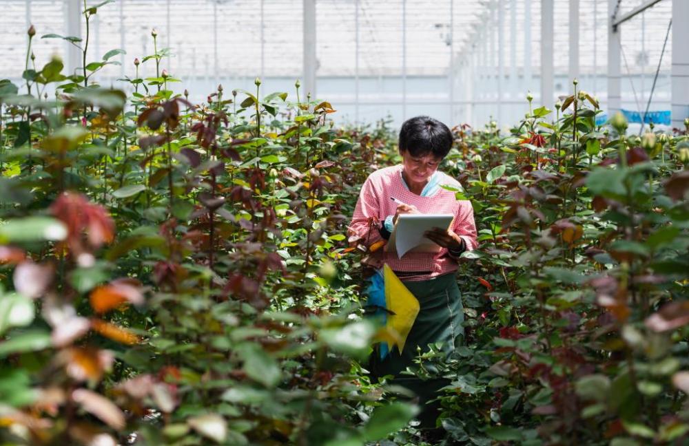 ??工作人員在麗江現(xiàn)代花卉產(chǎn)業(yè)園內(nèi)記錄鮮花生長狀況。新華社記者王冠森 攝