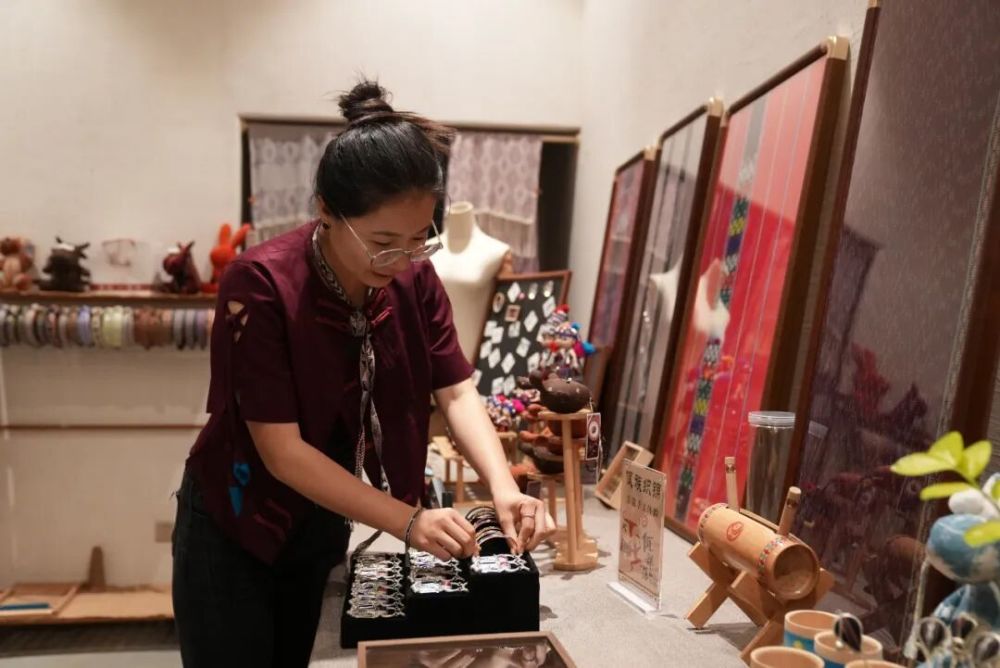 在西盟縣城的佤族織錦工作室里,廖靜文正在趕制一批新訂單,貨架上,織錦化妝鏡、杯套、耳釘?shù)任膭?chuàng)產(chǎn)品精致亮眼。