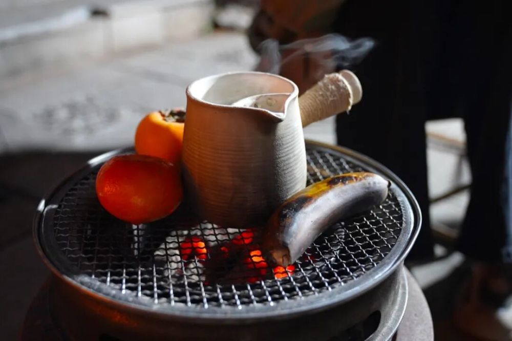 日落時(shí)分,江三木洛劇院廣場(chǎng)旁,冬日的爐火正旺。游客們圍爐而坐,親手將茶葉與焦糖在陶罐中翻炒,待茶香四溢后,注入清水與牛奶。爐邊還烤著柿子、橘子、香蕉等新鮮水果。不一會(huì)兒,暖乎乎的奶茶與香甜的烤水果便溫暖了每個(gè)人的手心。談笑風(fēng)生間,茶香浸潤(rùn)了冬夜,也拉近了彼此的距離。