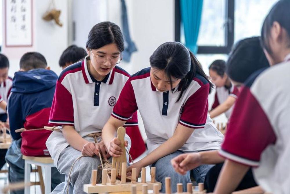 △2025年5月12日,云南威信縣第一中學(xué)的學(xué)生在紅色研學(xué)教育基地體驗(yàn)編織草鞋。