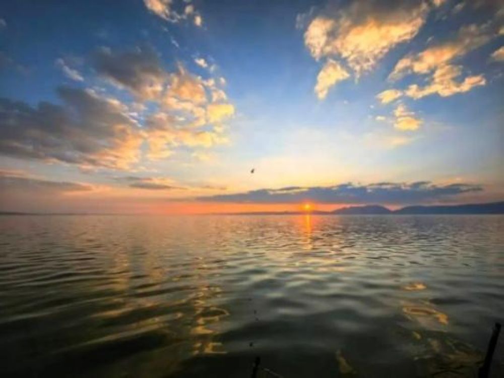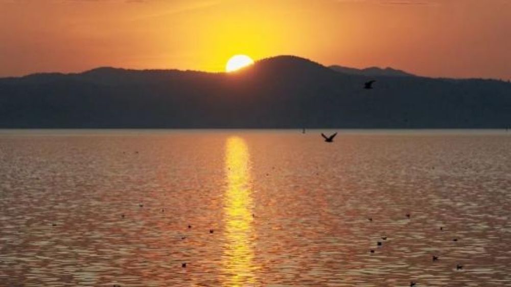 歸航的紅嘴鷗掠過金色湖面