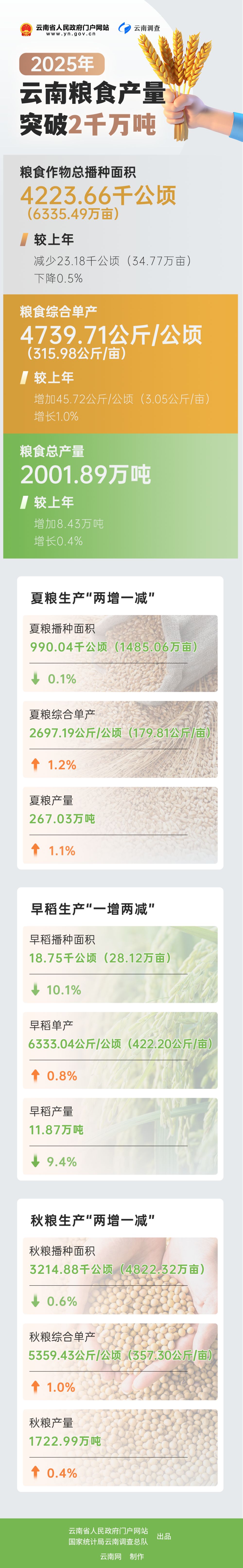 國(guó)家統(tǒng)計(jì)局云南調(diào)查總隊(duì)調(diào)查數(shù)據(jù)顯示:2025年,云南糧食作物總播種面積4223.66千公頃(6335.49萬(wàn)畝),較上年減少23.18千公頃(34.77萬(wàn)畝),下降0.5%;糧食綜合單產(chǎn)4739.71公斤/公頃(315.98公斤/畝),較上年增加45.72公斤/公頃(3.05公斤/畝),增長(zhǎng)1.0%;糧食總產(chǎn)量2001.89萬(wàn)噸,較上年增加8.43萬(wàn)噸,增長(zhǎng)0.4%。