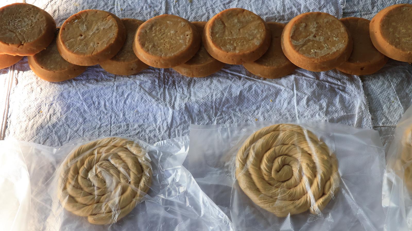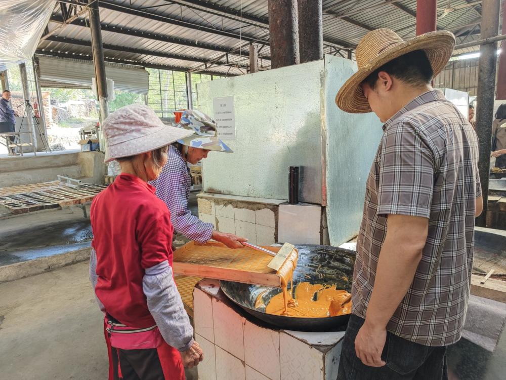 “西尼紅糖最大的特色就是不添加各種色素、添加劑,都是用古法,燒柴火熬制出來的。”除了傳統(tǒng)的圓形、愛心型的塊狀紅糖,西尼村還推出了特色的拉絲紅糖體驗(yàn)項(xiàng)目,讓游客在購買的同時(shí),能親身感受古法制糖的樂趣。“除了購買成品,還可以來體驗(yàn)拉絲紅糖,在出鍋之前把它盛出來,一直不停的拉,把它拉成白金色,也是很香的,有點(diǎn)像小時(shí)候吃的叮叮糖的口感。每次來買的人不光是買,他們也很喜歡來體驗(yàn)這個(gè)項(xiàng)目?!绷_丹說道。