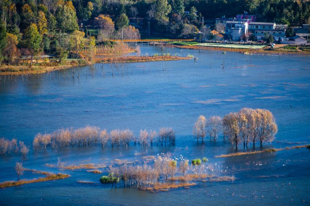 位于曲靖市會澤縣的念湖,每年11月至次年3月成為黑頸鶴的越冬天堂。清晨薄霧中,千余只黑頸鶴時而展翅掠過湖面,時而在淺灘優(yōu)雅踱步,成為當(dāng)?shù)刂匾纳锒鄻有员Wo成果的展示窗口。