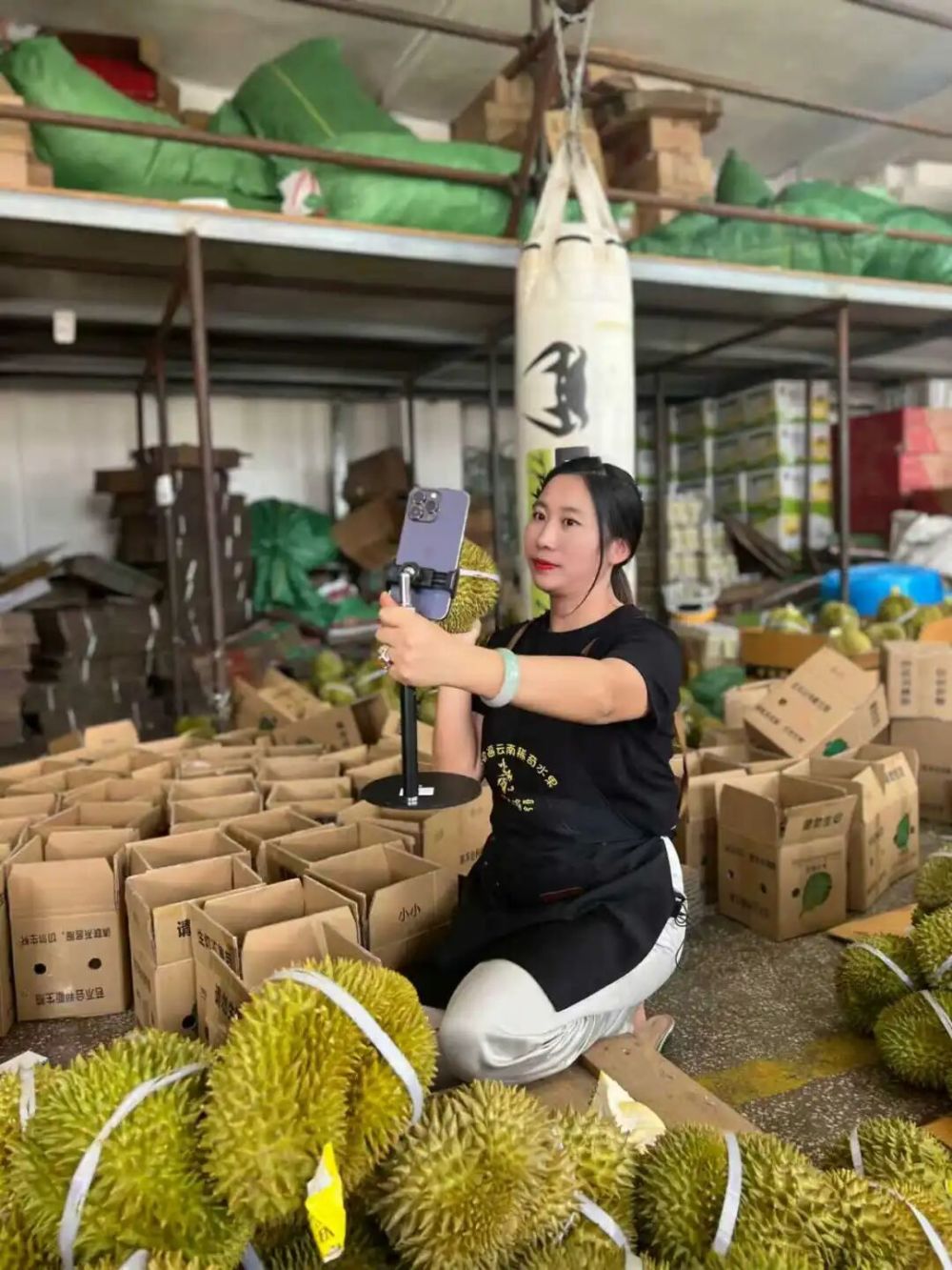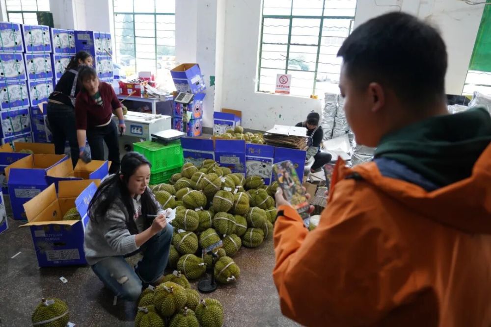 走進(jìn)小瑜家所在的倉庫,這里堆滿了榴蓮、沃柑、釋迦果等水果,幾位主播正忙得不可開交,一邊拿起水果,一邊介紹產(chǎn)地等信息,隨著一聲“三二一,上鏈接”一單單訂單成交,倉庫隨即開始打包。