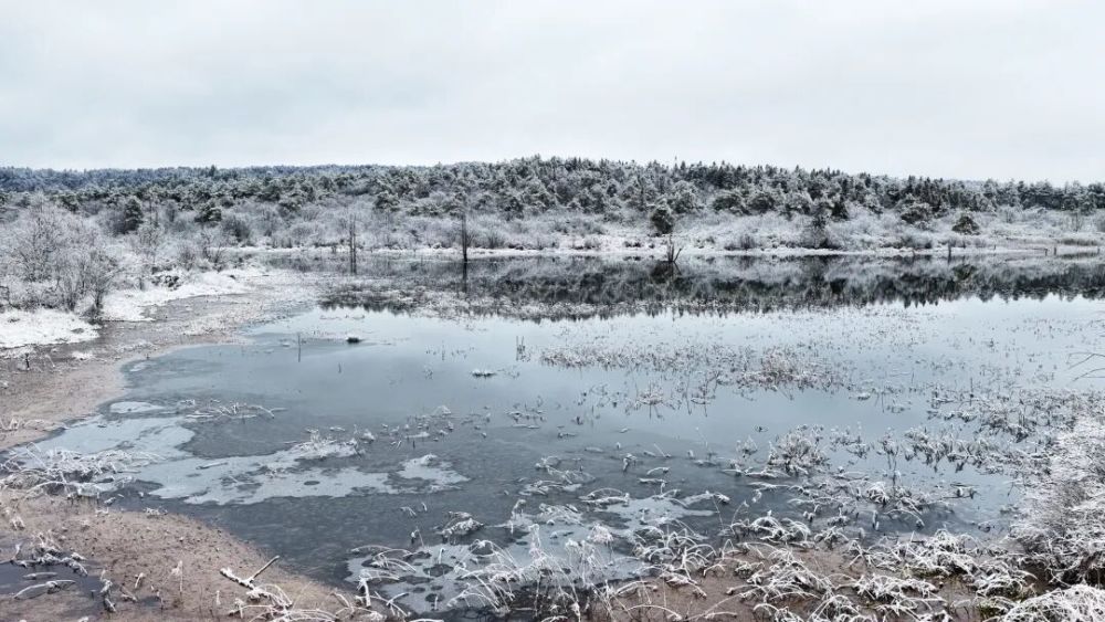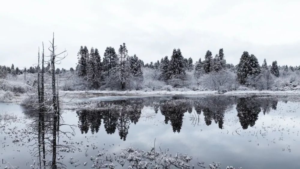 行至湖畔,冰面如鏡,悄然凝結著天光云影。雪落無聲,駐足細聽,方能察覺那幾乎不存在的聲響——是雪粒觸及枯葉的微顫,是冰面深處似有若無的脈動,是整片森林在雪被之下均勻的呼吸。