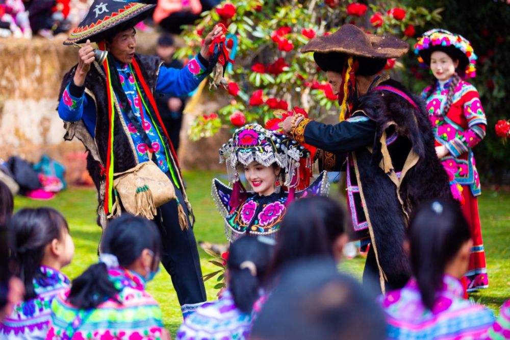 農(nóng)歷二月初八,雙柏的彝族虎文化節(jié)上,身著虎紋裝扮的舞者伴著古樂起舞,展現(xiàn)“老虎出山”“老虎播種”等古樸場景,盡顯神秘圖騰文化魅力;大姚曇華山的插花節(jié)則浪漫十足,漫山馬纓花盛開,彝家兒女以花為媒、以節(jié)傳情,古老傳說在花海中流淌。