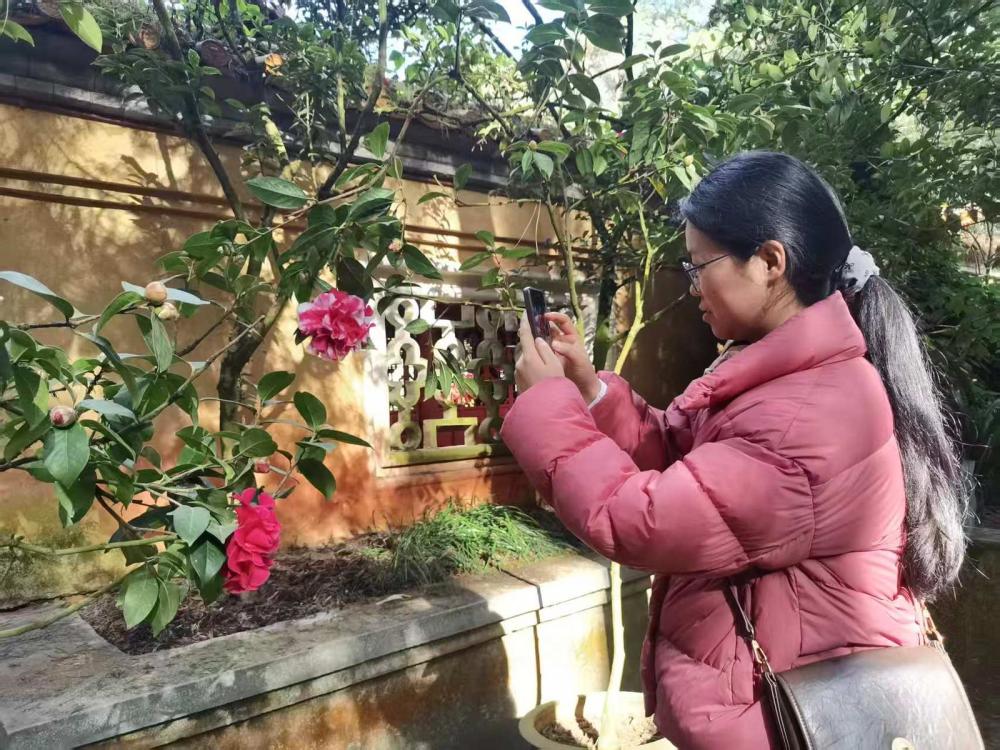 步入茶花園,仿佛闖入五彩斑斕的花之秘境。一盆盆、一株株山茶姿態(tài)各異:有的含苞待放,藏著幾分嬌羞;有的傲然盛開(kāi),盡顯雍容華貴。大大小小的茶花綴滿枝頭、綻放吐蕊,紅的耀眼奪目,粉的溫婉嬌羞,白的純凈圣潔。朵朵茶花空靈含蓄,與園內(nèi)亭臺(tái)樓閣相映成趣,景致如詩(shī)如畫(huà),置身其中,滿目的繁花令人陶醉不已。多次游覽秀山的安徽游客張雪,便被茶花園的景致深深吸引,不時(shí)駐足觀賞、拍照留念。
