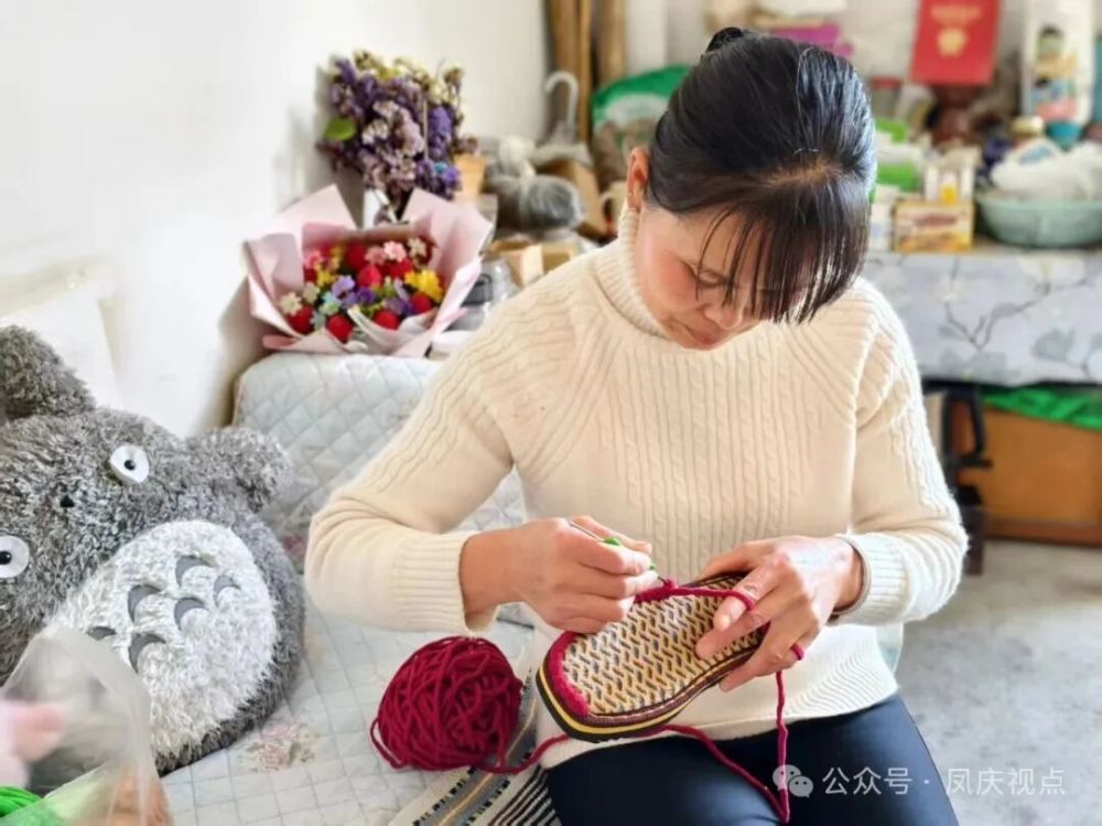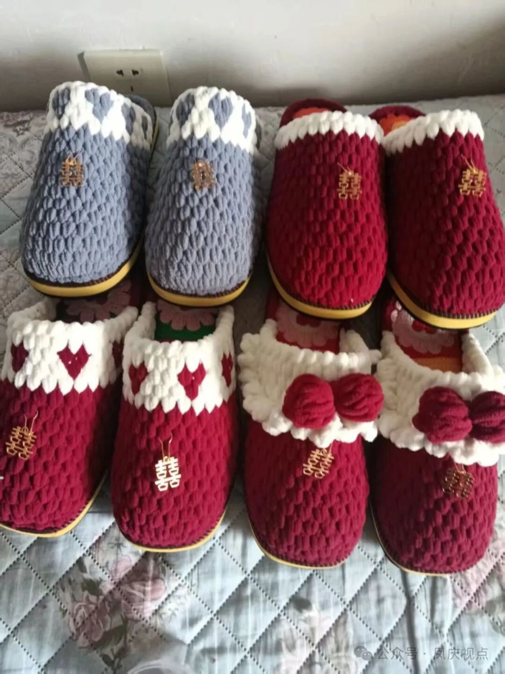 食堂后廚里,張陳紅將鍋碗瓢盆一一收拾干凈,結束一天的工作,回到家,她手中的工具便從廚刀換成了鉤針——彩色的毛線在指尖纏繞,不一會兒,一雙厚實的毛線拖鞋便漸漸成形。這雙帶著細繭的手,在灶臺的煙火與手作的溫度之間,找到了奇妙的平衡。