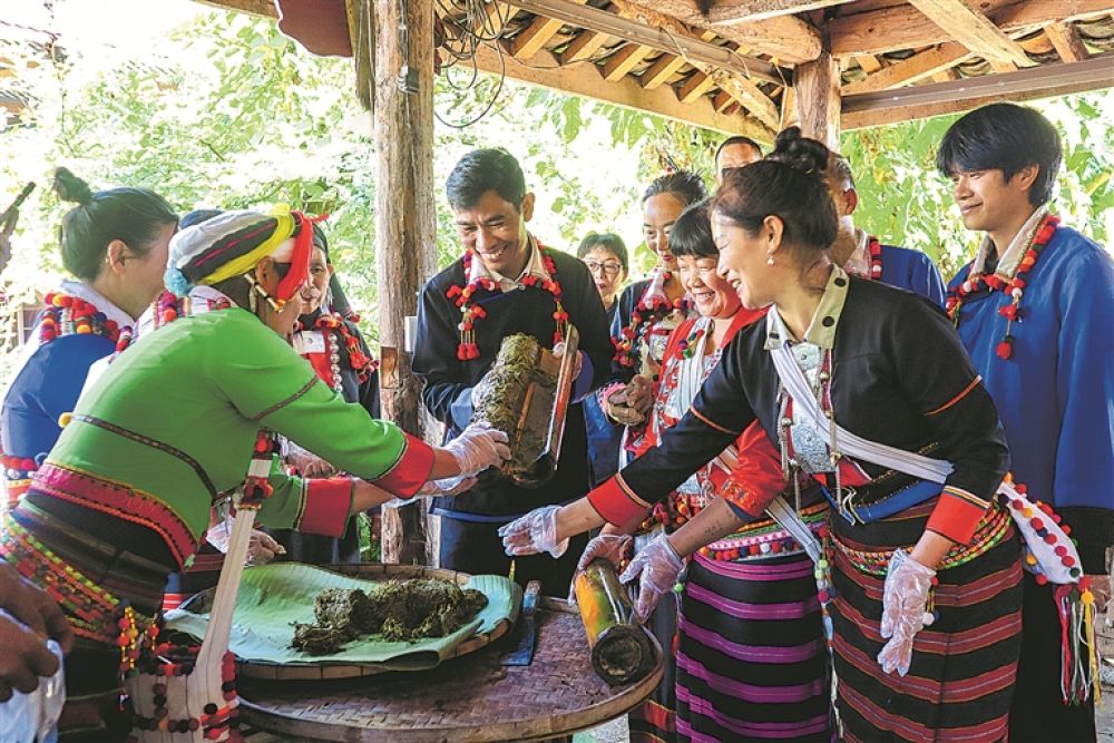 德昂酸茶產(chǎn)業(yè)在滬滇合作幫扶下煥發(fā)新生,標(biāo)準(zhǔn)化加工廠和體驗(yàn)中心相繼建成,全國(guó)人大代表、德昂族酸茶制作技藝傳承人楊春蘭堅(jiān)守古法技藝,帶動(dòng)整條產(chǎn)業(yè)鏈蓬勃發(fā)展。2024年,全鄉(xiāng)酸茶產(chǎn)量20余噸,產(chǎn)值超1000萬(wàn)元,而德宏州酸茶產(chǎn)業(yè)總產(chǎn)值已突破5億元,古老酸茶成為帶動(dòng)各族群眾增收的“金葉子”。最近推出的“堅(jiān)果宴”“酸茶宴”等特色體驗(yàn),延伸了農(nóng)業(yè)產(chǎn)業(yè)鏈,形成“一顆堅(jiān)果聯(lián)產(chǎn)業(yè),一杯酸茶系民生”的發(fā)展模式,讓各民族在經(jīng)濟(jì)發(fā)展中形成“你中有我、我中有你”的共同體。