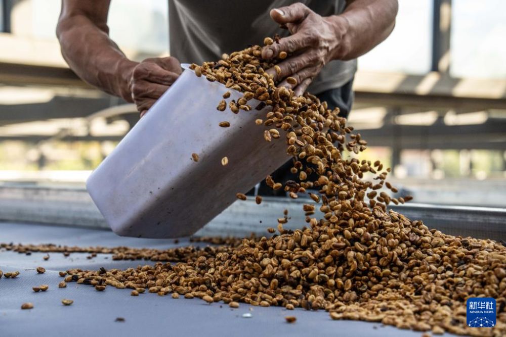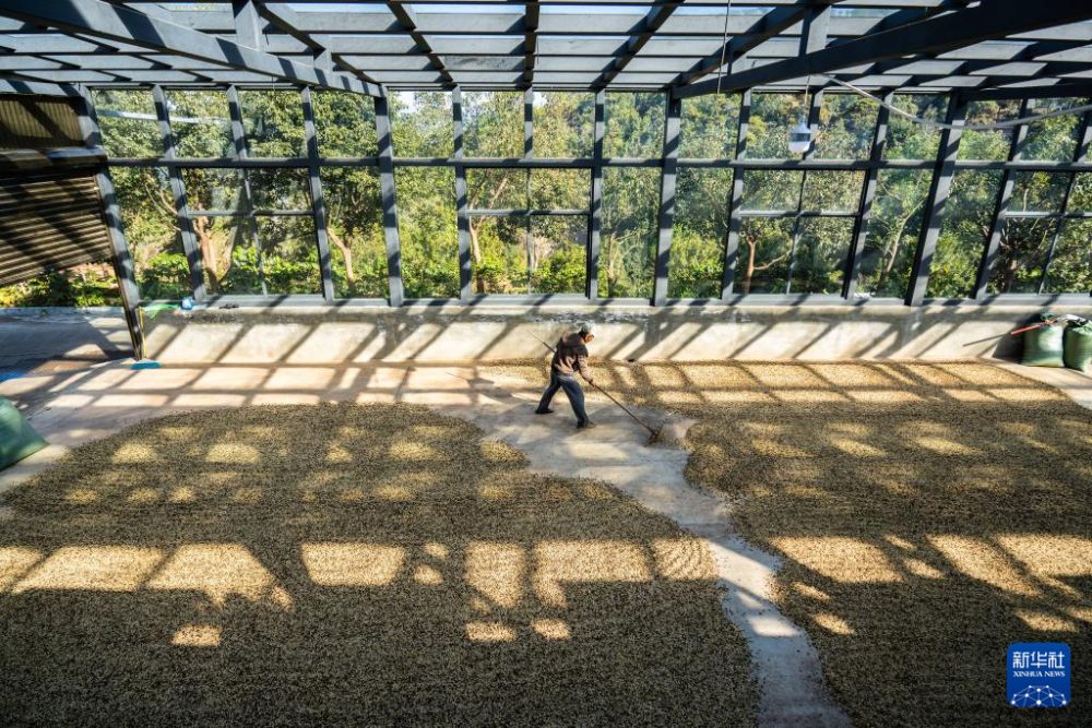 1月21日,咖農(nóng)在臨滄市臨翔區(qū)邦東鄉(xiāng)昔歸村昔歸咖啡莊園晾曬咖啡豆。新華社記者 高詠薇 攝