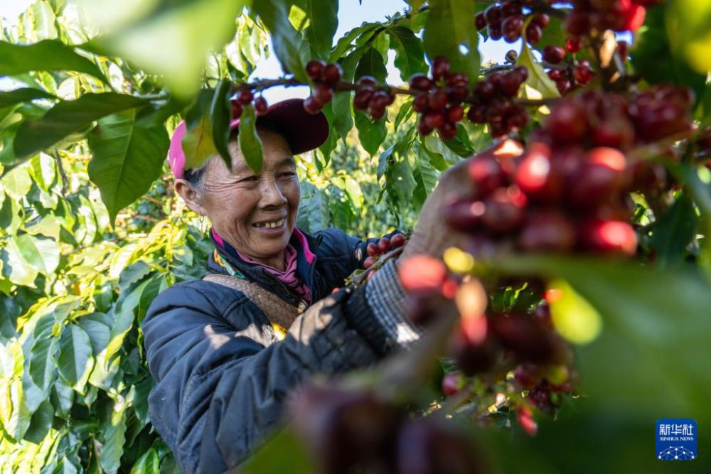 1月23日,咖農(nóng)在臨滄市雙江縣沙河鄉(xiāng)陳家寨村云頂筑巢咖啡莊園采摘咖啡果。新華社記者 高詠薇 攝