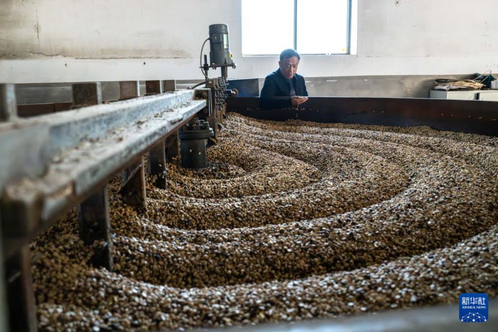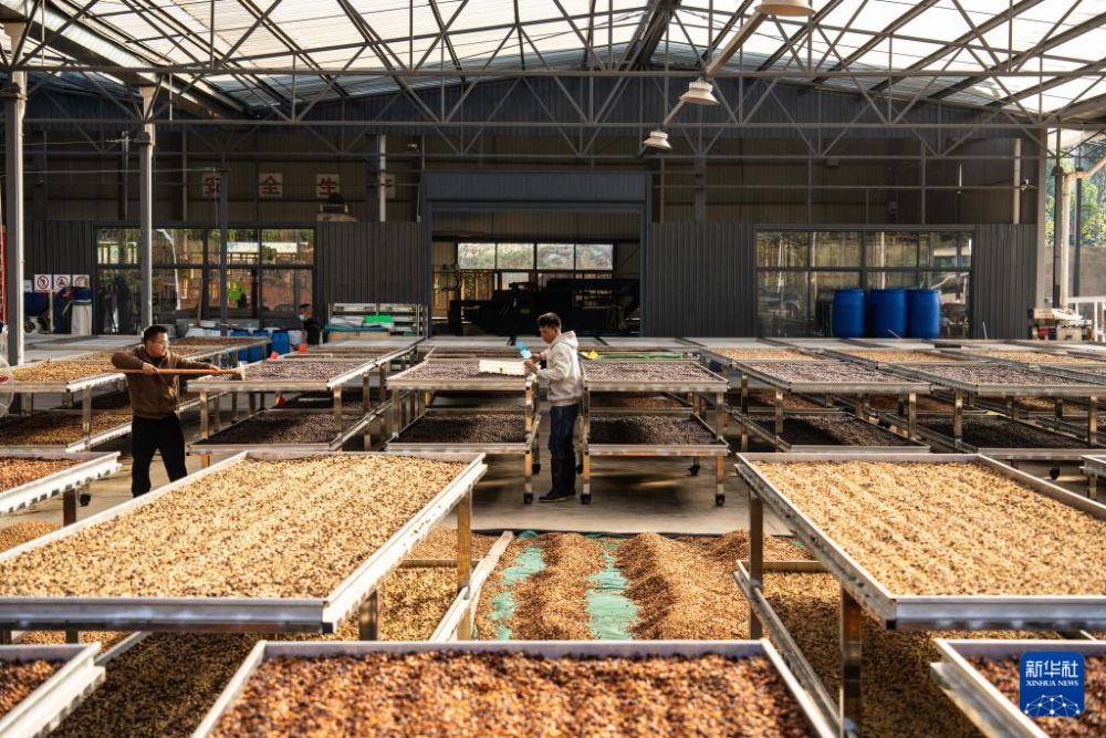 1月22日,咖農(nóng)在臨滄市臨翔區(qū)圈內(nèi)鄉(xiāng)云佳咖啡莊園查看咖啡豆處理情況。新華社記者 高詠薇 攝