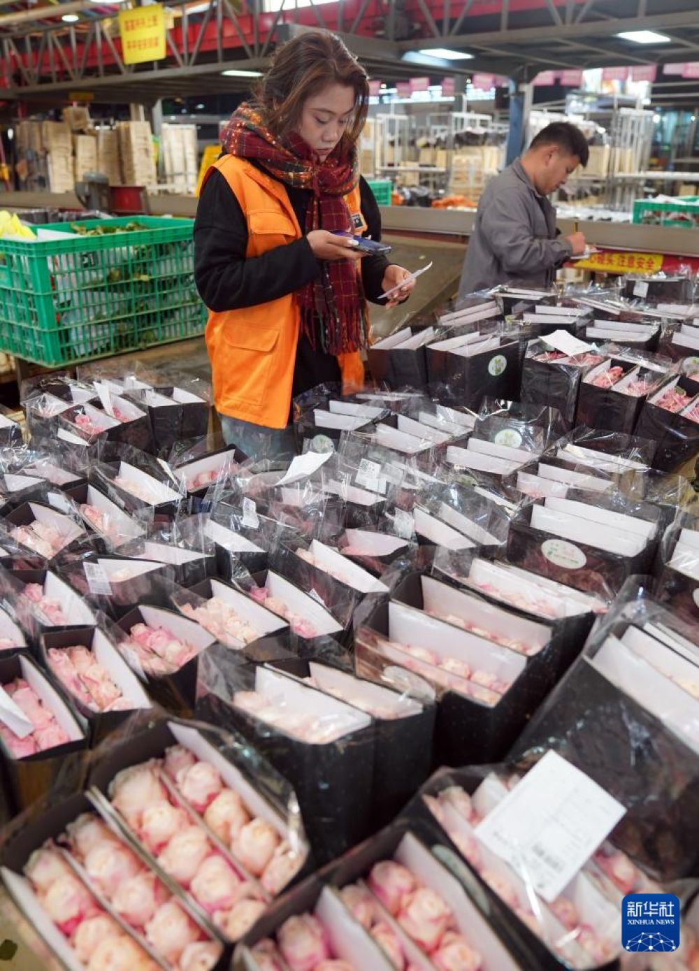 2月1日,發(fā)貨倉(cāng)工作人員在昆明的斗南花卉市場(chǎng)內(nèi)檢查鮮切花。