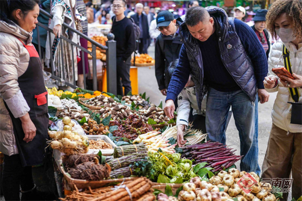 那一只只正逐漸被裝滿的菜籃子便是最好的例證。籃子里,是昭通蘋果的脆甜、玉溪藍莓的清潤、河口香蕉的金黃、臨滄堅果的醇香,還有見手青、牛肝菌等高原菌類特有的山野氣息。特色各異的農(nóng)產(chǎn)品在春節(jié)前夕集中亮相,讓“買年貨”變成了一次直觀感受云南立體農(nóng)業(yè)的全過程。