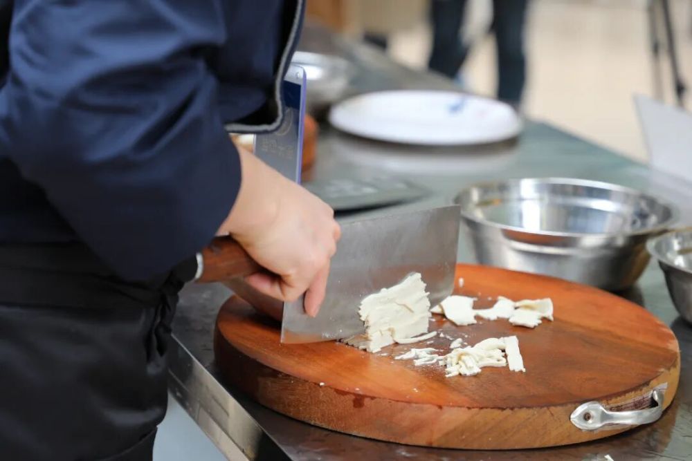 廚藝競技環(huán)節(jié),每組師徒需按要求合作完成一道小炒黃牛肉及一道以牛肉為主的特色拿手菜。評委從職業(yè)素養(yǎng)、衛(wèi)生安全、味感質(zhì)感、創(chuàng)意技法等七方面綜合評分。在燉煮間隙,學(xué)徒們以豆腐為材展開刀工競賽,刀起刀落間,粗細(xì)均勻、長短一致、不斷不散的豆腐絲展現(xiàn)出扎實功底。賽場上氣氛熱烈,選手們各顯身手,鍋勺碰撞、香氣四溢。