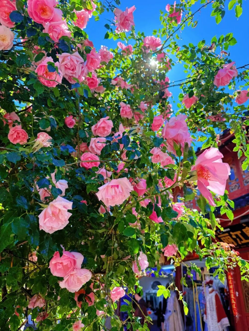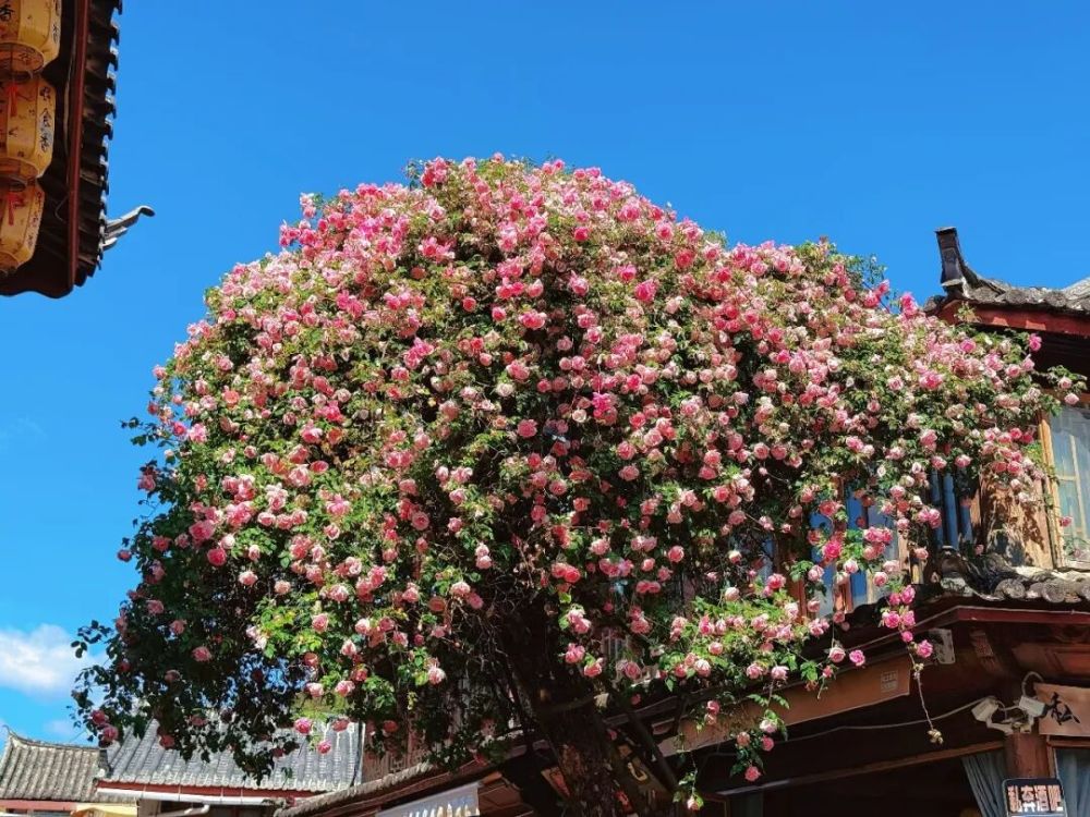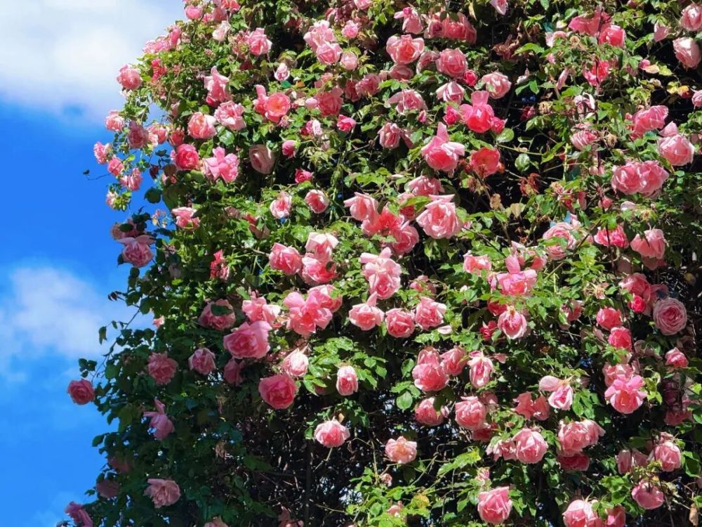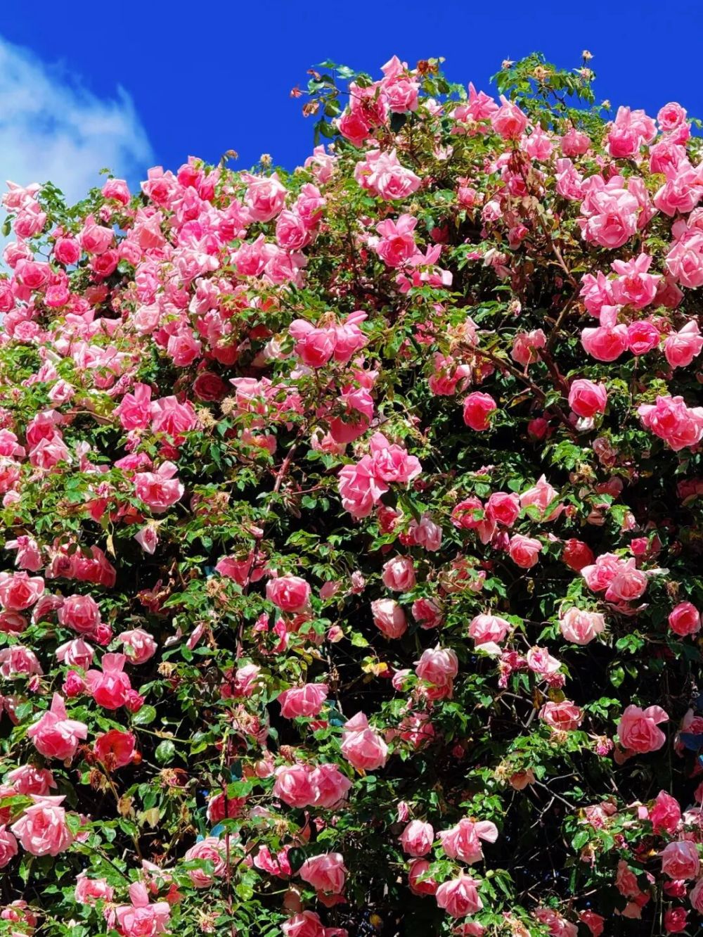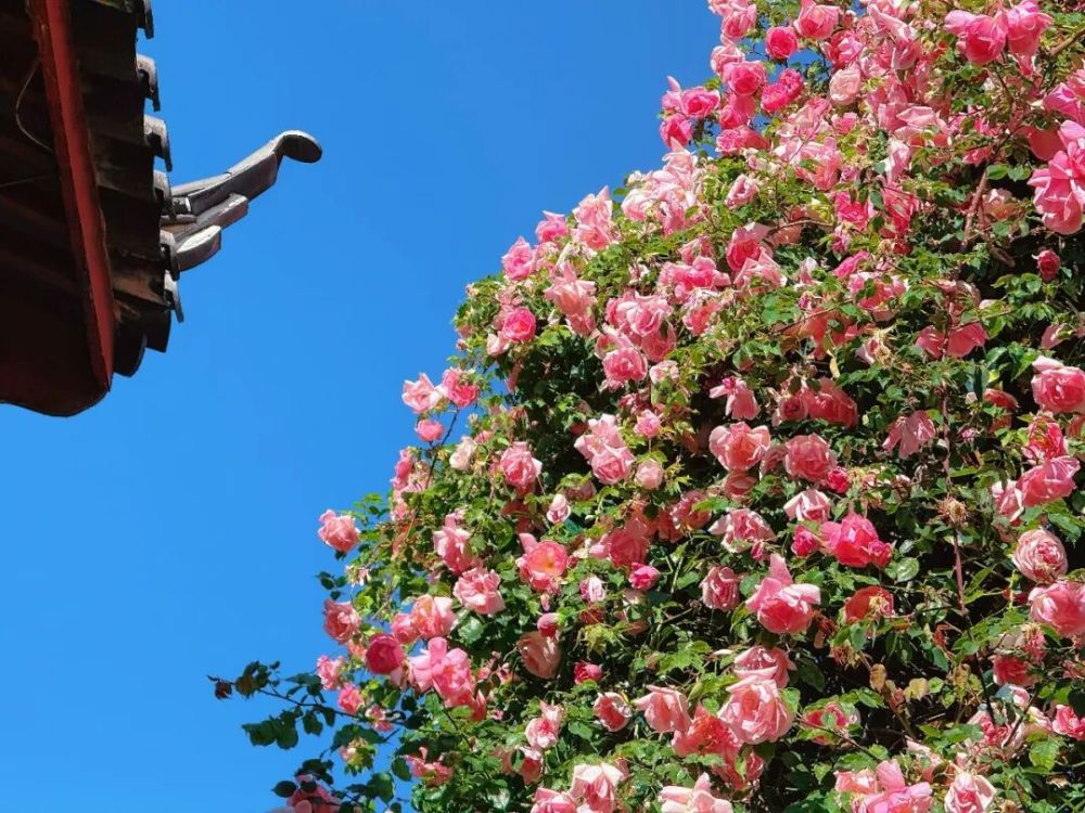 月季樹在街巷轉(zhuǎn)角熱烈綻放