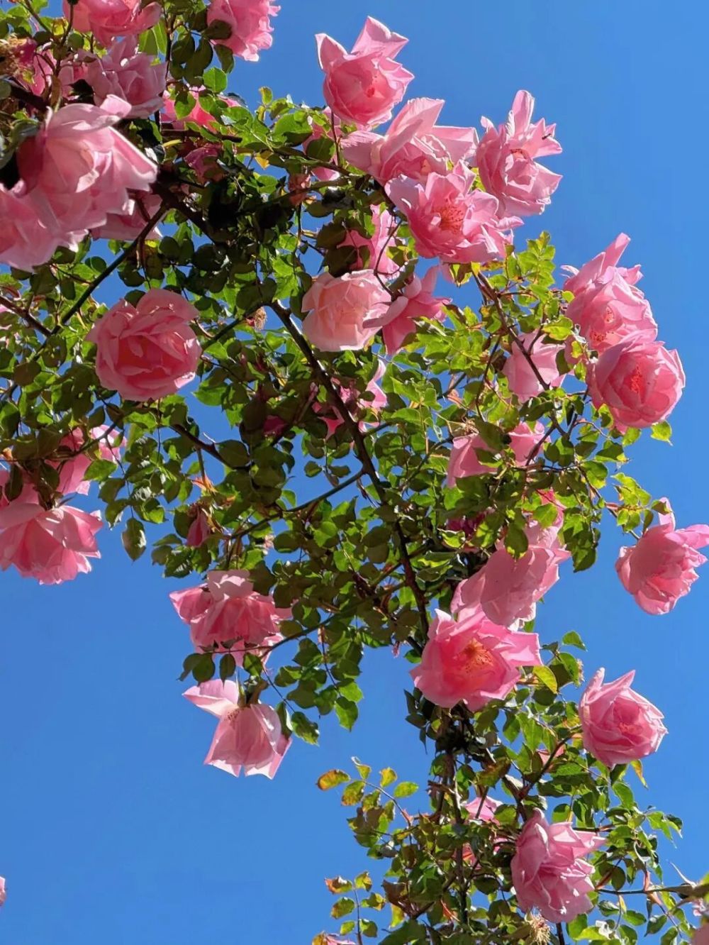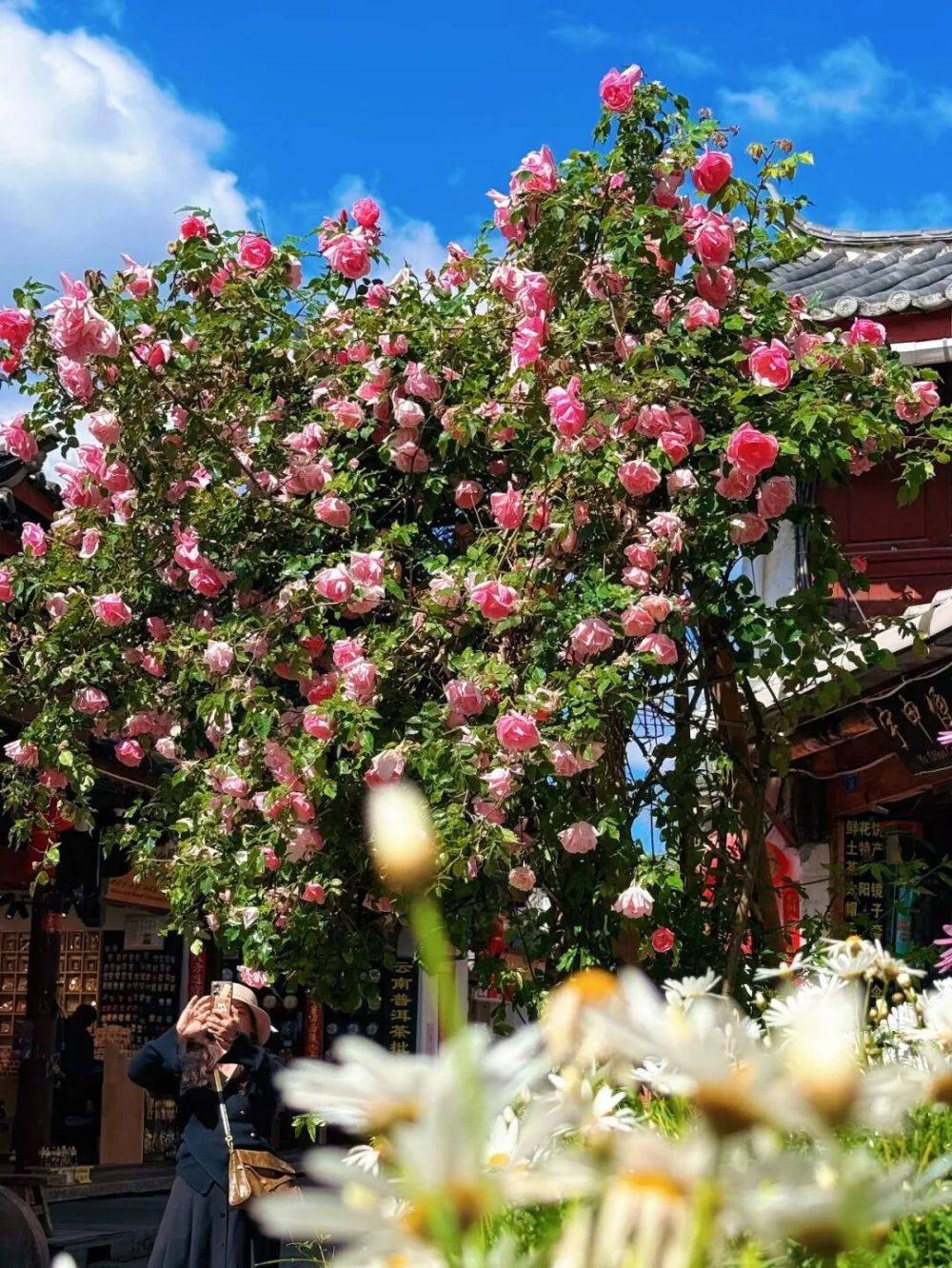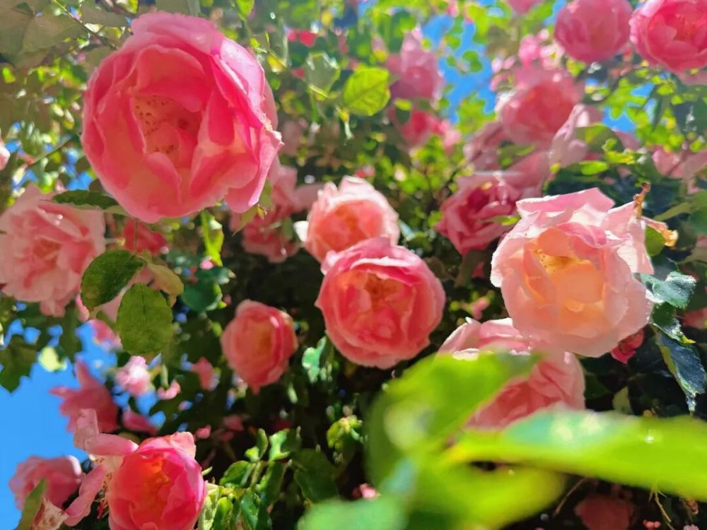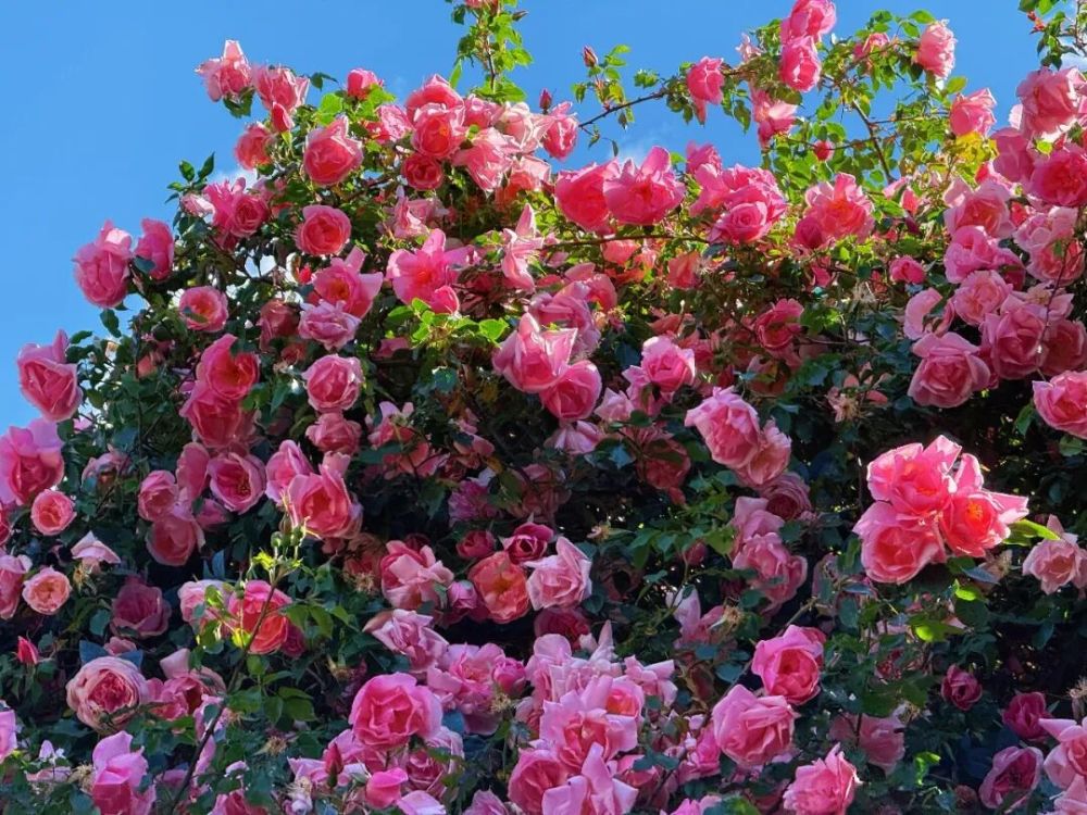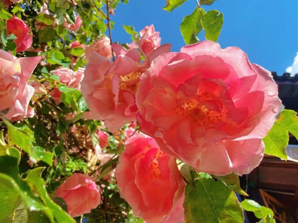 月季樹在街巷轉(zhuǎn)角熱烈綻放