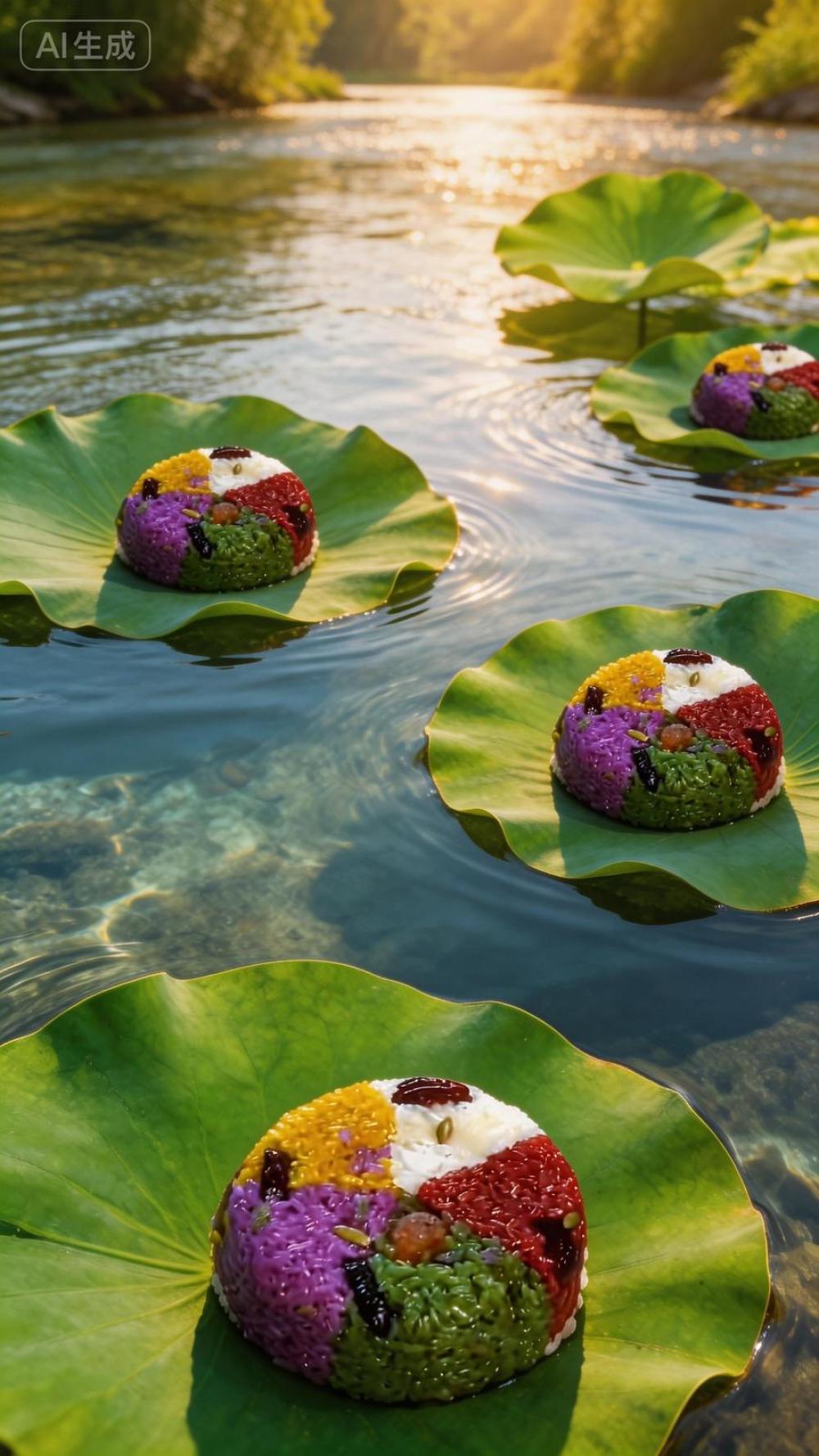碧綠荷葉托著一個(gè)個(gè)彩色八寶飯