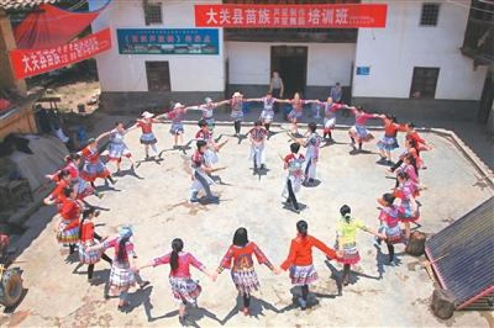 在大關(guān)縣天星鎮(zhèn)綠南村,苗族群眾在接受蘆笙舞蹈培訓(xùn)。
