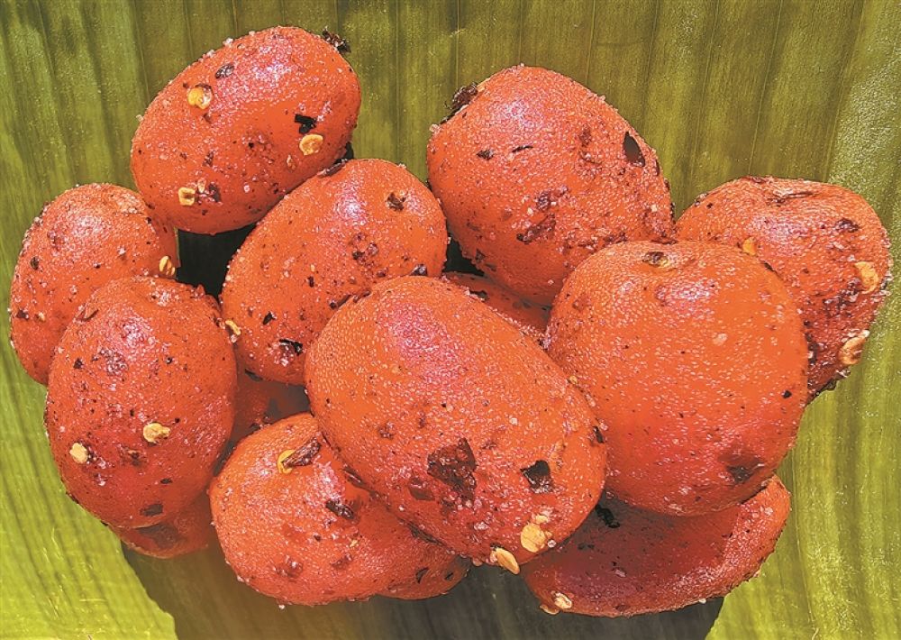 德宏人調(diào)理羊奶果的手藝,藏著最地道的邊陲風(fēng)味。生果切片,拌上焙香的糊辣椒、鹽巴、香菜,酸爽里裹著辛香,一口便醒神開胃;熟果輕捏即破,清甜汁水滿口生津,半熟的果子若與甘蔗紅糖同入陶罐腌制幾日,開壇時香氣能漫過半個院落。最具風(fēng)情的,當(dāng)屬七分熟羊奶果做的撒苤:舂碎的果肉混上熟牛肉、韭菜、老緬芫荽、香蓼、小米辣,調(diào)味拌勻,配上米線、烤肉、生菜蘸食,酸、辣、鮮、香在舌尖層層綻放,這是獨屬于德宏的季節(jié)限定美味。