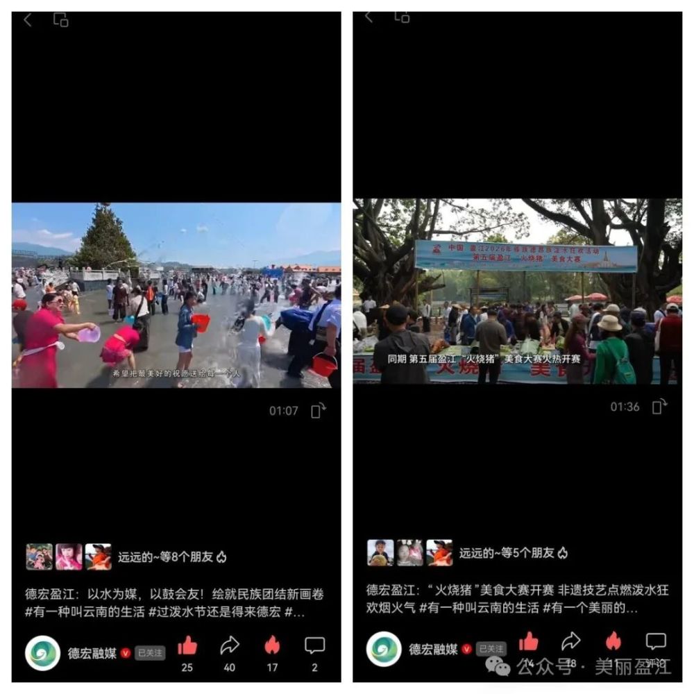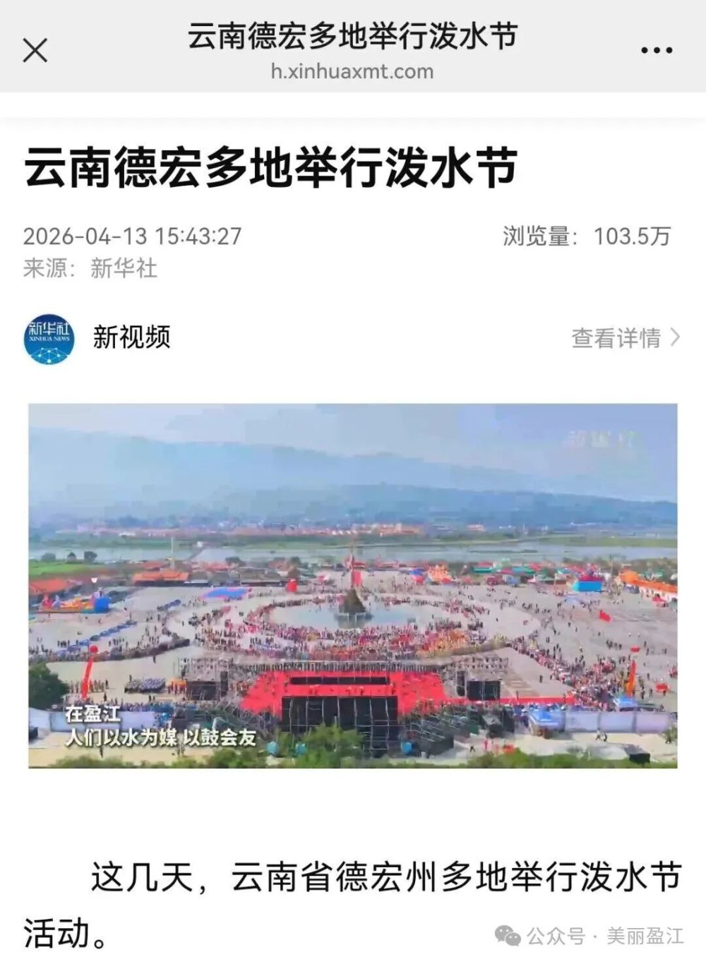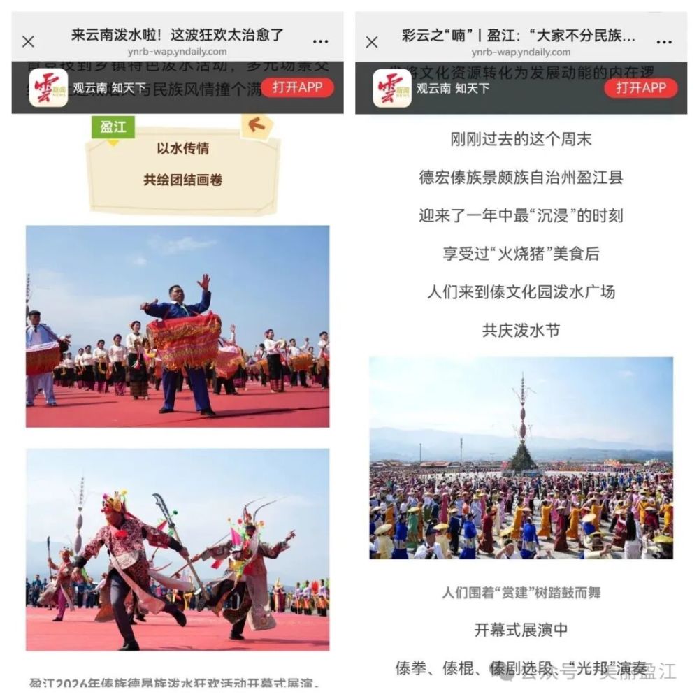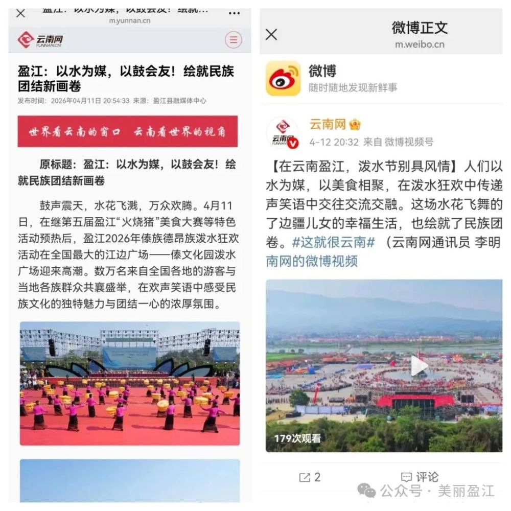 水花映邊疆,盛會引矚目。盈江2026年傣族德昂族潑水狂歡活動圓滿落下帷幕,這場浸潤了非遺底蘊、飽含著民族溫情、迸發(fā)出青春活力的江畔盛典,持續(xù)刷屏各大平臺,中央、省、州三級主流媒體深度聚焦,本地“邊小V”暖心發(fā)聲,各自媒體全網(wǎng)聯(lián)動擴散,多維全景講好盈江故事,讓“美麗幸福盈江”響徹全網(wǎng)、譽滿四方。