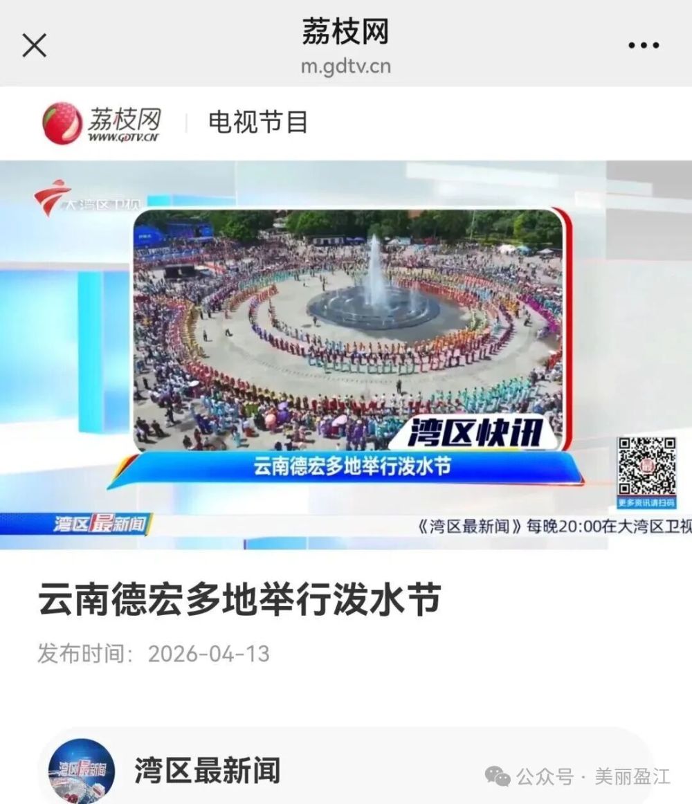 盈江潑水狂歡活動在我國粵語地區(qū)受到關(guān)注,相關(guān)新聞報道在廣東廣播電視臺旗下粵語衛(wèi)星電視頻道——大灣區(qū)衛(wèi)視播出。
