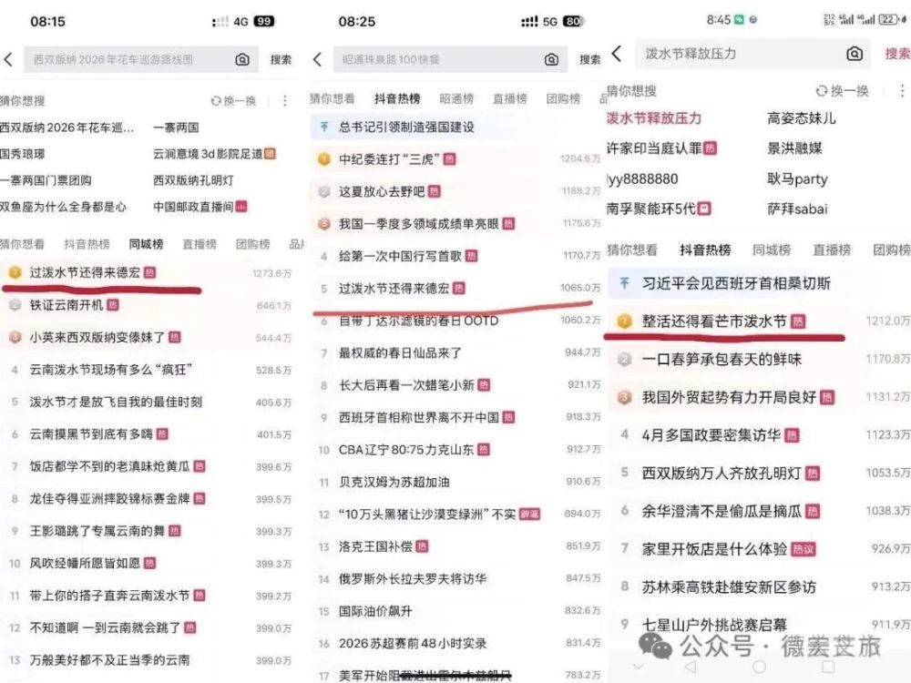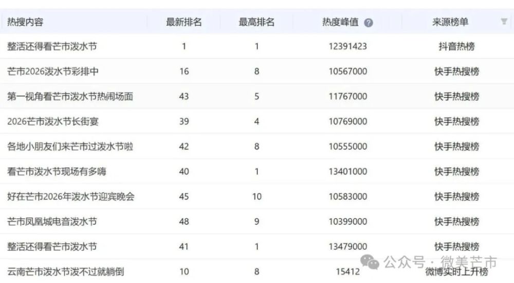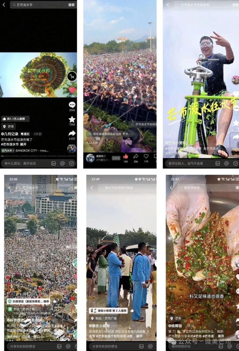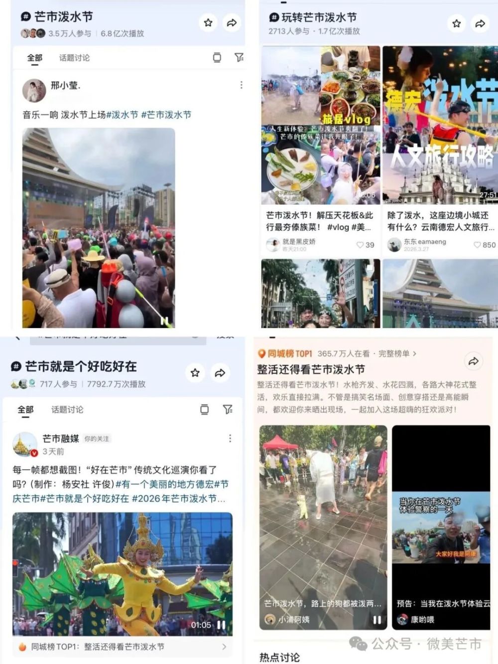 聚力全民發(fā)聲,助推宣傳升溫。持續(xù)打造#芒市潑水節(jié) #玩轉(zhuǎn)芒市潑水節(jié) #芒市就是個(gè)好吃好在 等特色網(wǎng)絡(luò)話題,聯(lián)動(dòng)各級(jí)媒體、本土自媒體達(dá)人同向發(fā)力,集中推送潑水節(jié)高光瞬間、民俗特色場(chǎng)景,充分調(diào)動(dòng)廣大網(wǎng)民的參與積極性。其中“黑馬”話題#整活還得看芒市潑水節(jié) #看芒市潑水節(jié)現(xiàn)場(chǎng)有多嗨 火速登陸抖音、快手熱(搜)榜第一,成為熱議的焦點(diǎn),進(jìn)一步帶動(dòng)了潑水節(jié)相關(guān)話題熱度?;顒?dòng)期間,各地網(wǎng)民主動(dòng)參與、熱情互動(dòng),紛紛轉(zhuǎn)發(fā)潑水節(jié)精彩瞬間、打卡狂歡現(xiàn)場(chǎng),分享自身的潑水體驗(yàn)與芒市印象,形成了全民參與、全民傳播、全民熱議的良好傳播生態(tài),讓喜慶祥和、溫馨美滿的節(jié)日氛圍浸潤(rùn)全網(wǎng)。截至活動(dòng)圓滿落幕,芒市潑水節(jié)相關(guān)核心話題全網(wǎng)瀏覽量累計(jì)已達(dá)8億+,進(jìn)一步擦亮芒市文旅品牌,讓潑水節(jié)文化走出地方、風(fēng)靡全網(wǎng),全方位提升芒市城市文旅影響力。