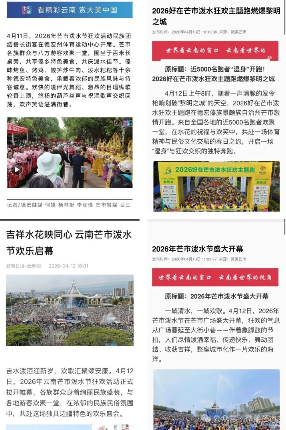 媒體矩陣發(fā)力,構(gòu)建立體傳播格局。統(tǒng)籌聯(lián)動(dòng)中央、省、州、市100余家權(quán)威媒體,累計(jì)刊發(fā)稿件510條,全方位解讀潑水節(jié)的文化內(nèi)涵與民族溫情,實(shí)現(xiàn)從中央到地方、從主流媒體到本地媒體的全方位覆蓋,讓芒市潑水節(jié)的魅力傳遍大江南北。央廣網(wǎng)推出報(bào)道《潑水同歡樂(lè) 盛裝迎客來(lái)》,收獲68.2萬(wàn)閱讀量。新華網(wǎng)、人民日?qǐng)?bào)、云南網(wǎng)、德宏融媒、芒市融媒等各級(jí)媒體平臺(tái)相繼發(fā)力,推出《2026好在芒市潑水狂歡主題跑燃爆黎明之城》《萬(wàn)人采花啟幕潑水狂歡 芒市民族風(fēng)情點(diǎn)燃節(jié)日熱潮》等多篇優(yōu)質(zhì)報(bào)道,實(shí)時(shí)傳遞節(jié)日熱烈氛圍,全面提升芒市潑水節(jié)的全國(guó)影響力。全國(guó)40余家媒體同步直播,瀏覽量達(dá)70萬(wàn)+,以互動(dòng)形式吸引網(wǎng)民在線體驗(yàn)潑水節(jié)的魅力,其中,人民日?qǐng)?bào)主持的“好在芒市·萬(wàn)人狂歡”開(kāi)幕式直播吸引16萬(wàn)人在線互動(dòng),讓網(wǎng)民直觀感受潑水節(jié)魅力與文化底蘊(yùn)。
