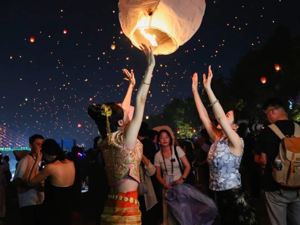 隨著第一盞孔明燈冉冉升起,寂靜的夜空瞬間被“喚醒”。短短幾分鐘內(nèi),上萬盞孔明燈如璀璨的星河般從人們手中升騰而起,漫天燈火隨風(fēng)搖曳,場(chǎng)面蔚為壯觀。燈火映照在瀾滄江面,呈現(xiàn)出“水天一色”的夢(mèng)幻景象。江面接住燈火,天空擁抱心愿。鏡頭定格的是畫面,心中留下的是震撼。這一刻,西雙版納不再只是一個(gè)地名,而是萬人共同仰望的同一個(gè)方向。