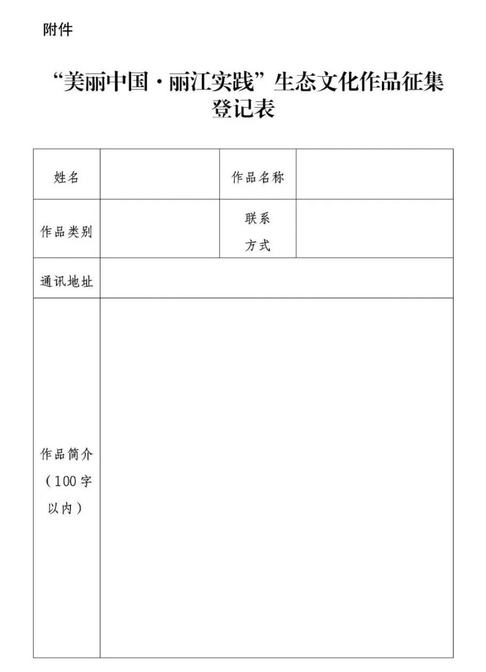 請(qǐng)將作品及《“美麗中國(guó)·麗江實(shí)踐”生態(tài)文化作品征集登記表》(見(jiàn)附件)一并打包,以“作品類別+作者姓名+聯(lián)系電話”命名郵件主題和壓縮包,發(fā)送至活動(dòng)指定郵箱:ljshjxjzx@126.com。