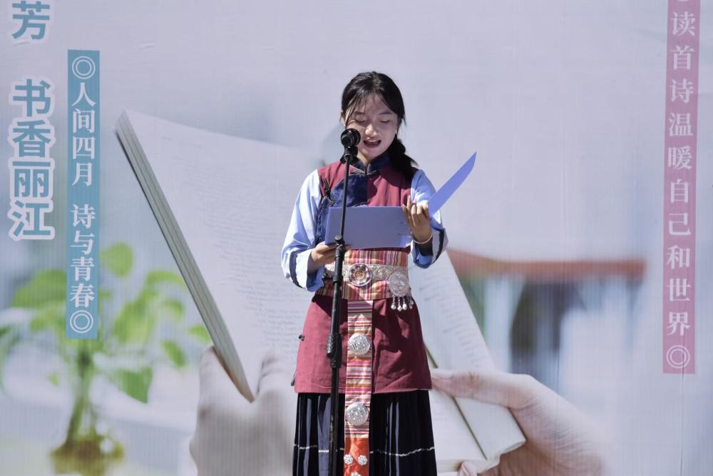 如果說童趣書市守護的是童心,那么美食街小廣場上的“人間四月 詩與青春”詩詞朗誦會,則涌動著青春的朝氣。麗江文化旅游學院的學生們身著民族服飾,現(xiàn)場朗誦詩文,從古典詩詞到現(xiàn)代散文,從麗江本土文學到中外經典,聲聲朗誦引人駐足聆聽。來自上海的游客段金辰被瑯瑯書聲吸引,他動情地說:“我一直知曉麗江‘天雨流芳,博學善思’的佳話,今天身臨其境更覺觸動,在麗江我真切感受到閱讀的魅力,以及它由內而外賦予人的美好與力量。”