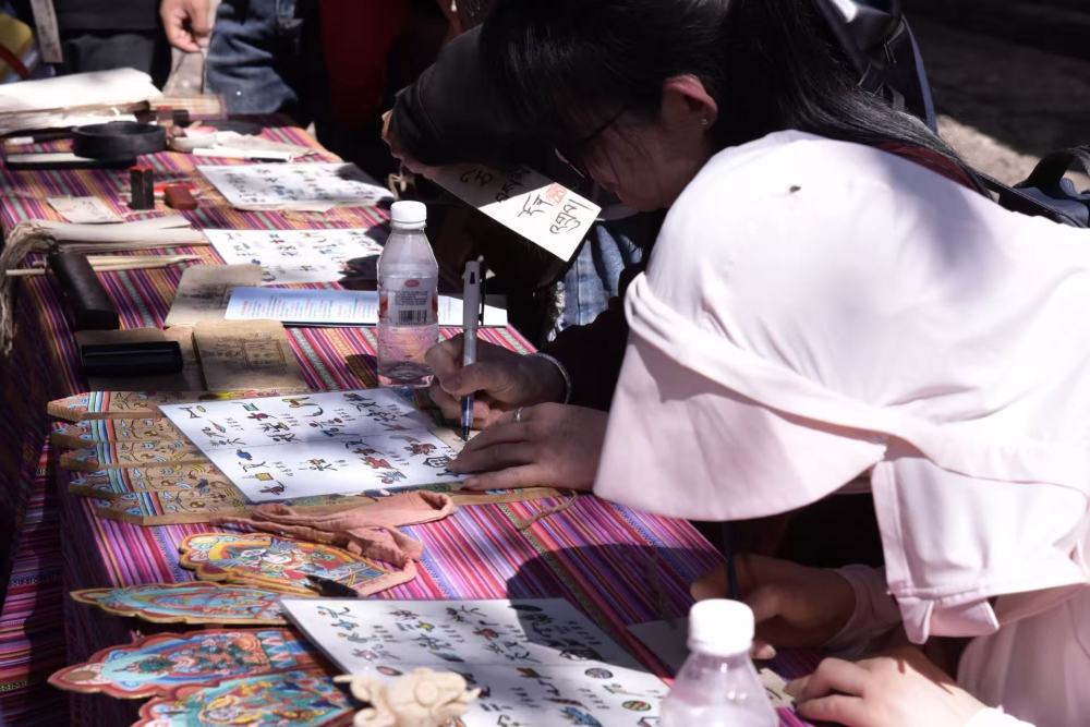 在官門口“納西文化體驗點”,市民、游客書寫東巴象形文字。(見習記者 和麗菊 攝)