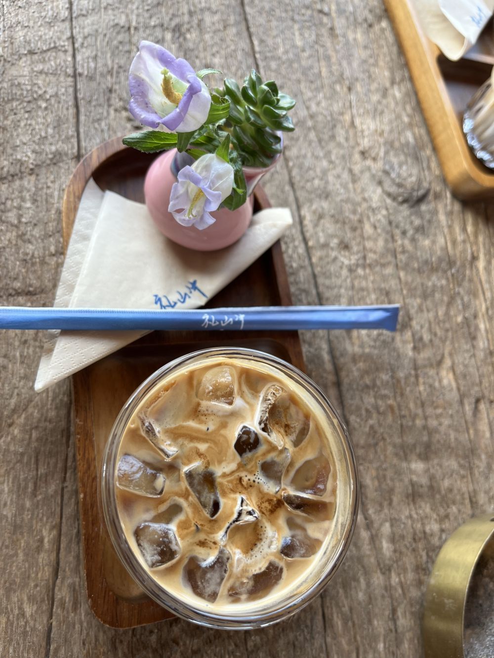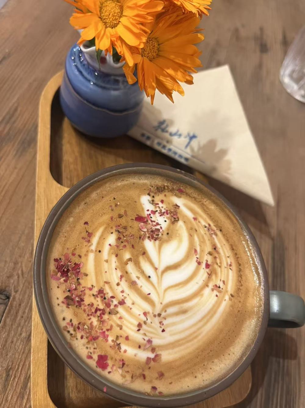 咖啡店的每一杯咖啡出品都透著匠心與巧思,咖啡師將“春花入盤”的浪漫理念融入細節(jié)之中。每一杯咖啡的裝盤,都精心搭配了當季鮮花,讓花香與咖香相得益彰:冰拿鐵的托盤上,斜插著一枝淡紫色風鈴花,花瓣的清雅與奶咖的琥珀色交織,清新雅致;手沖咖啡的托盤旁,擺放著一小瓶粉白相間的鮮切花,醇厚的咖香中融入了春日的清甜,入口更添韻味;就連與咖啡配套的文創(chuàng)產品都印著“禮山沖”的專屬標識,與店內的花景、咖香、納西元素完美呼應,細節(jié)之處盡顯用心。