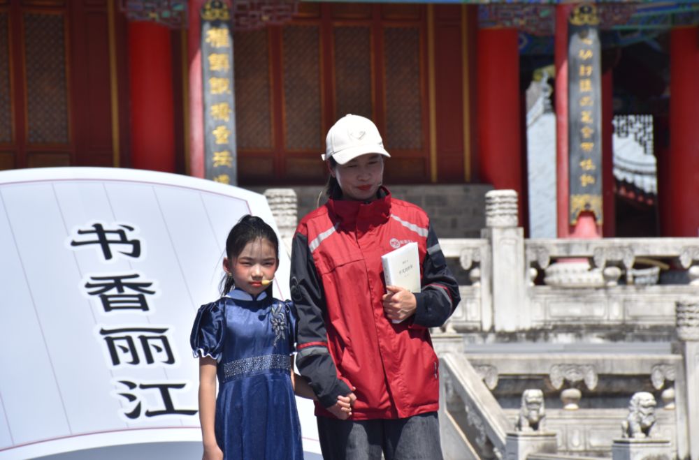 快遞員王潤開與女兒王一凡登臺(tái)共讀《平凡的世界》經(jīng)典片段。(麗江融媒記者 楊四娟 攝)